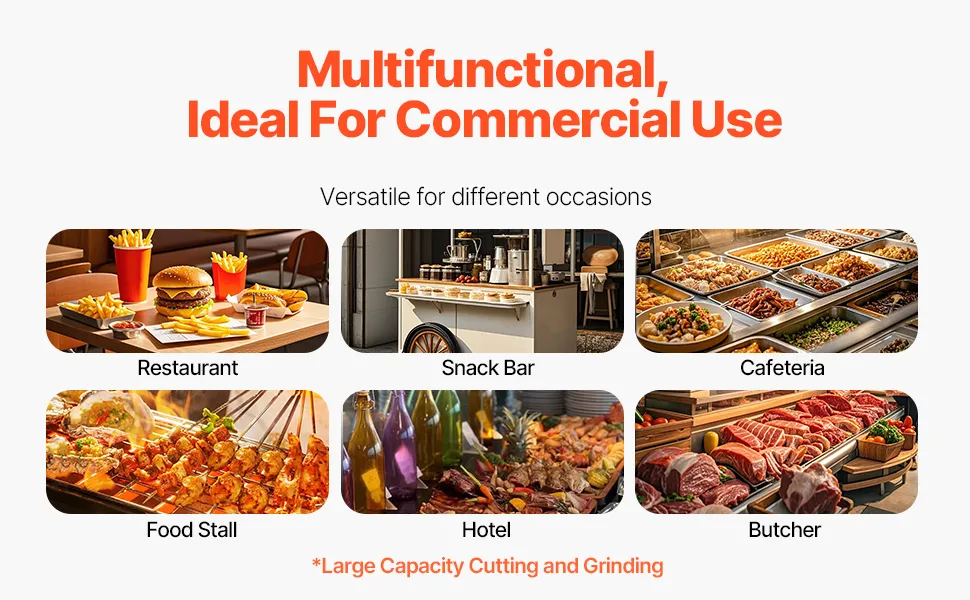 Dieser gewerbliche Fleischwolf und -schneider eignet sich zum Mahlen und Schneiden von Fleisch, Fisch und Gemüse und ist ideal für Küchen, Restaurants und Fabriken – er dient sowohl dem privaten als auch dem gewerblichen Bedarf.