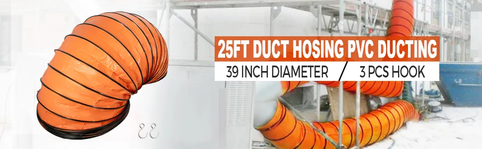 Unsere brandneuen Belüftungsschlauch mit einem Durchmesser von 39 Zoll sind flexibel und tragbar. Er besteht aus schwer entflammbarem Polyvinyl. Mit den mitgelieferten Nylonseile kann der Lüfter einfach installiert werden. Die Lasthaken dienen zum einfachen Aufhängen von Schlauch.