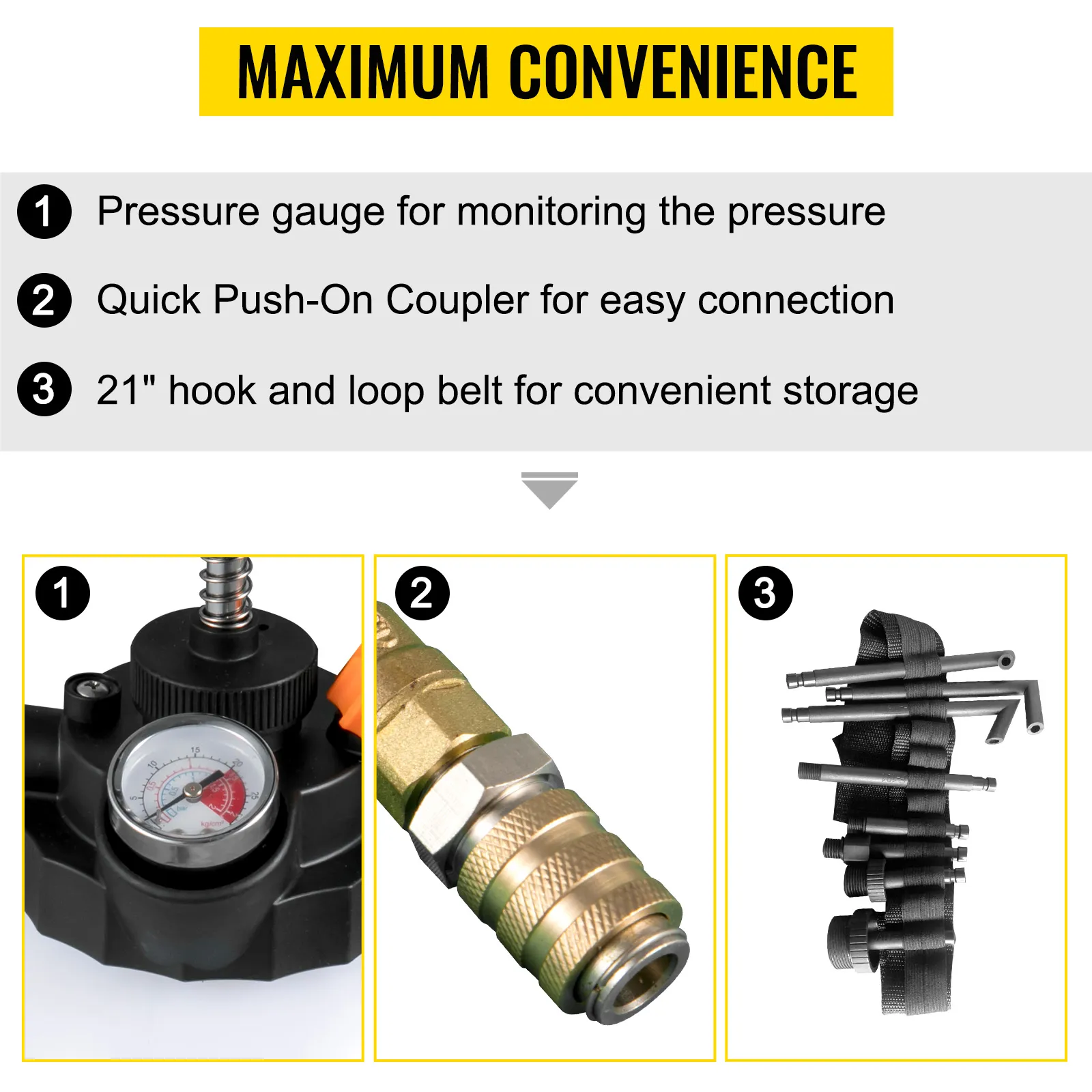 Die Kupplung lässt sich mit nur einem Druck leicht an- und abkoppeln, das Manometer ermöglicht eine einfache Überwachung des Drucks im Tank. Und der Gürtel und das Verlängerungsband können die Adapter an Ort und Stelle halten, ohne dass die Gefahr besteht, sie zu verlieren.