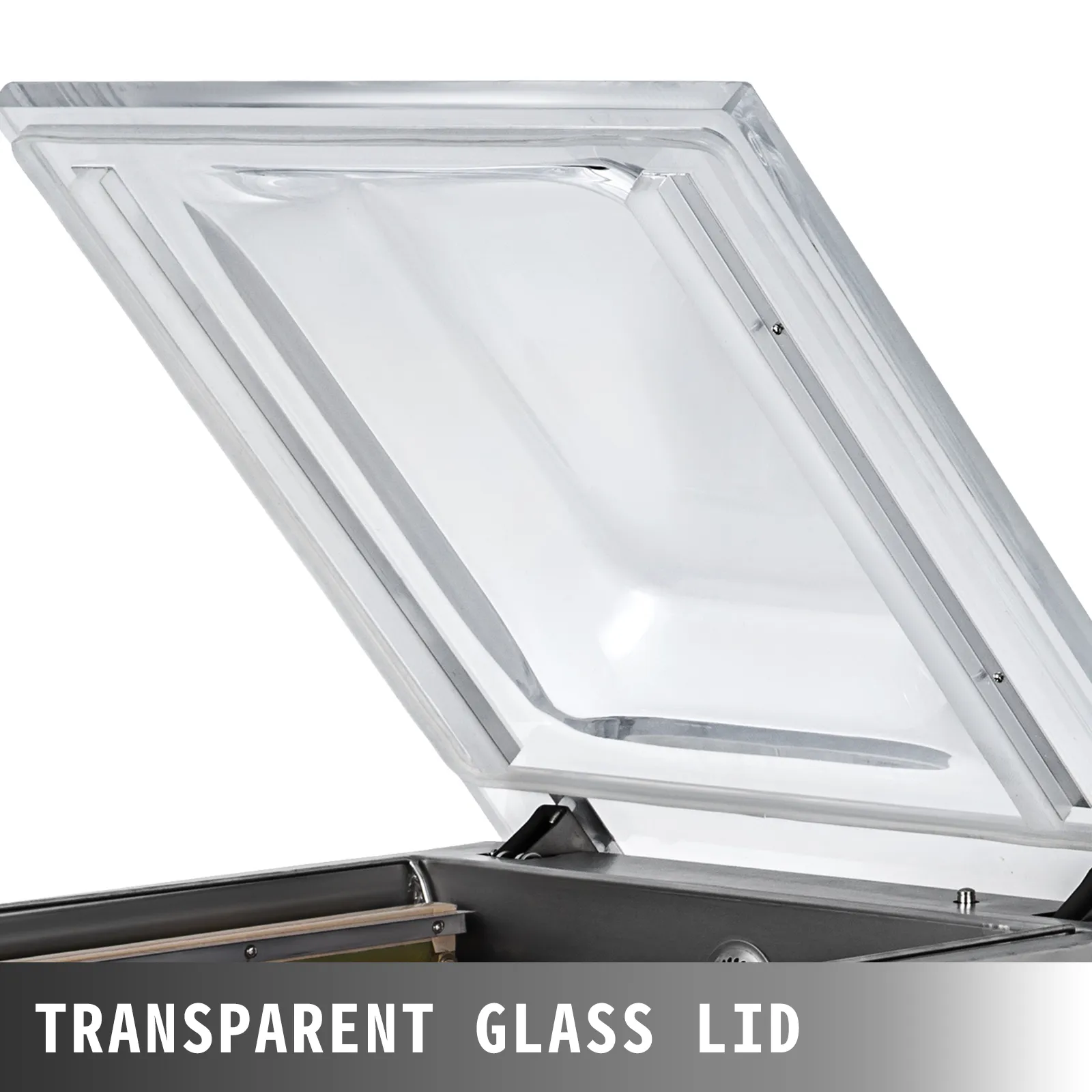Die Höhe der Versiegelungskammer beträgt 200 mm. Transparenter Deckel aus organischem Glas mit Sicherheitsschnalle zur Fixierung des Deckels bei Vakuum und Versiegelung. Benutzer können den gesamten Prozess durch den Deckel beobachten.