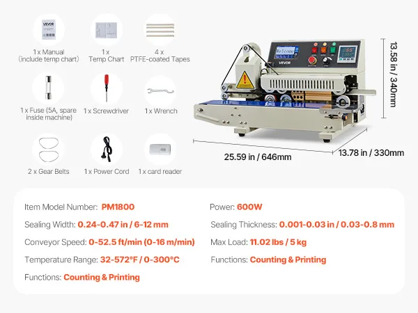 Komplettes Zubehör: Diese Siegelmaschine wird mit Zahnriemen, PTFE-Band und Sicherung für Backup und Wartung geliefert. Ersatzteile helfen, Ausfallzeiten zu reduzieren und die Produktion ohne unerwartete Unterbrechungen am Laufen zu halten