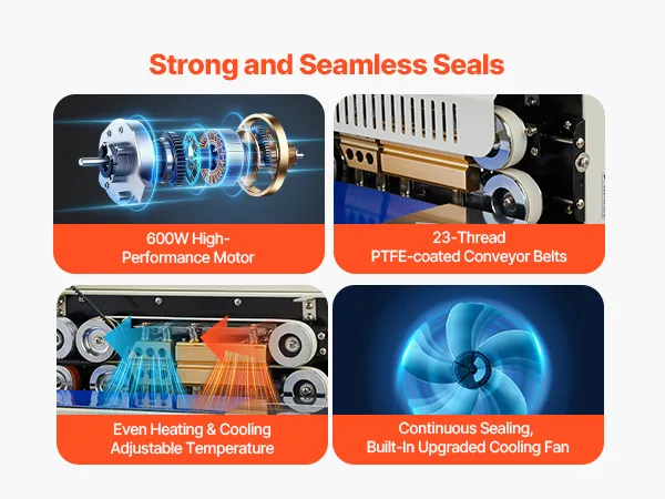 Schnelles Versiegeln: Die kontinuierliche Versiegelungsmaschine bietet mit ihrem 600-W-Motor viel Leistung und erreicht Geschwindigkeiten von bis zu 16 m/min. Sie bietet stabile Leistung und beschleunigt das Verpacken für unterschiedliche Produktionsanforderungen.