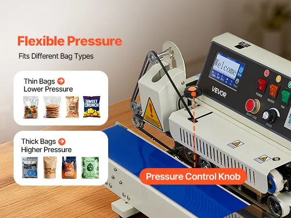 Passend für viele Beuteltypen: Die Siegelbreite ist von 6 bis 12 mm einstellbar und bietet Flexibilität für kleine und große Beutel. Die Endlosband-Siegelmaschine erleichtert Ihnen die Handhabung unterschiedlicher Verpackungen und steigert die Effizienz Ihrer Produktionslinie