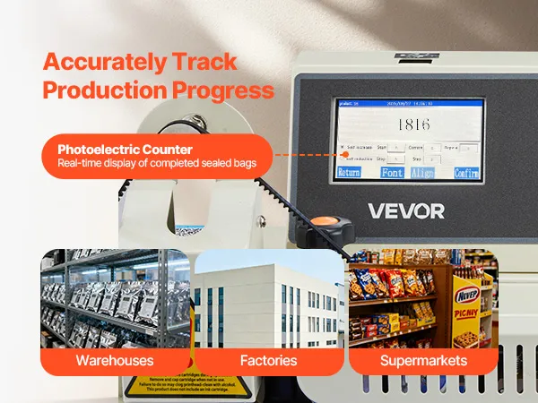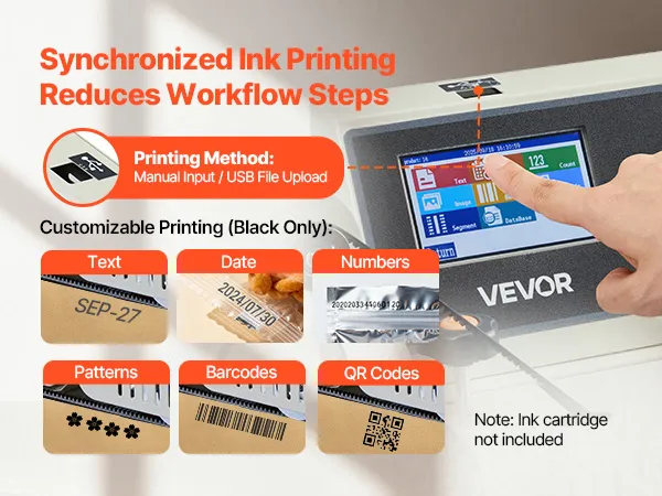 Vielseitige Funktionen: Das Bandsiegelgerät druckt Text, Daten, Zahlen, Logos, Barcodes und QR-Codes über manuelle Eingabe oder USB-Dateien. Tinte ist separat erhältlich. Ein eingebauter Zähler erfasst versiegelte Beutel in Echtzeit für eine einfache Planung