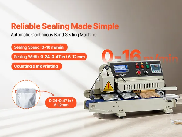 VEVOR Kontinuierliche Versiegelungsmaschine, 6–12 mm Siegelbreite, Horizontal, mit Tintendruck, Siegelmaschine, Temperatur & Geschwindigkeit einstellbar, für 0,03–0,8 mm Plastiktüten
