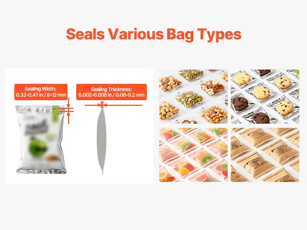 Passend für viele Beutel: Mit einer einstellbaren Siegelbreite von 8 bis 12 mm eignet sich das Siegelgerät für Plastik-, Kraftpapier- oder Folienbeutel. Ideal zum Versiegeln von Süßigkeiten, Brot oder Keksen, egal ob für den Heimgebrauch oder den Verkauf in kleinen Unternehmen.