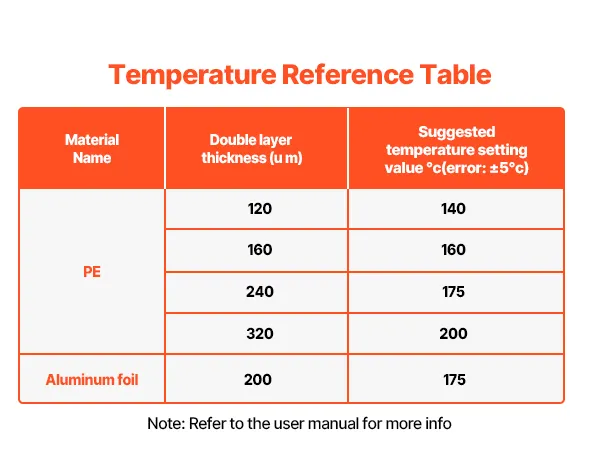 Einfache Bedienung: Stellen Sie die Temperatur mithilfe der Tabelle von 50 bis 250 °C ein, ohne endloses Testen. Klein, aber leistungsstark, ist diese automatische Dauerversiegelungsmaschine praktisch für Haushalte, Bäckereien, Werkstätten oder Geschäfte, die eine effiziente Versiegelung benötigen