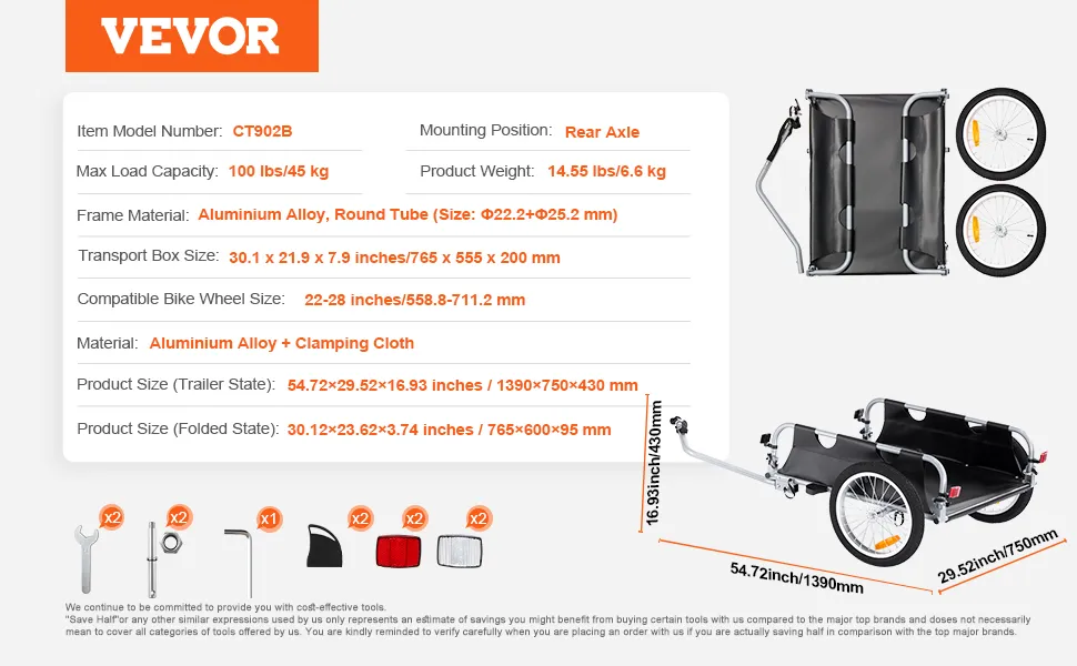 Dieser Fahrradanhänger kann bis zu 45 kg Gewicht tragen. Von Campingutensilien bis hin zu Ihren täglichen Notwendigkeiten bietet er den Platz, den Sie brauchen. Außerdem passt er auf Fahrräder mit 558,8-711,2 mm Rädern und ist somit vielseitig für jede Fahrt geeignet.