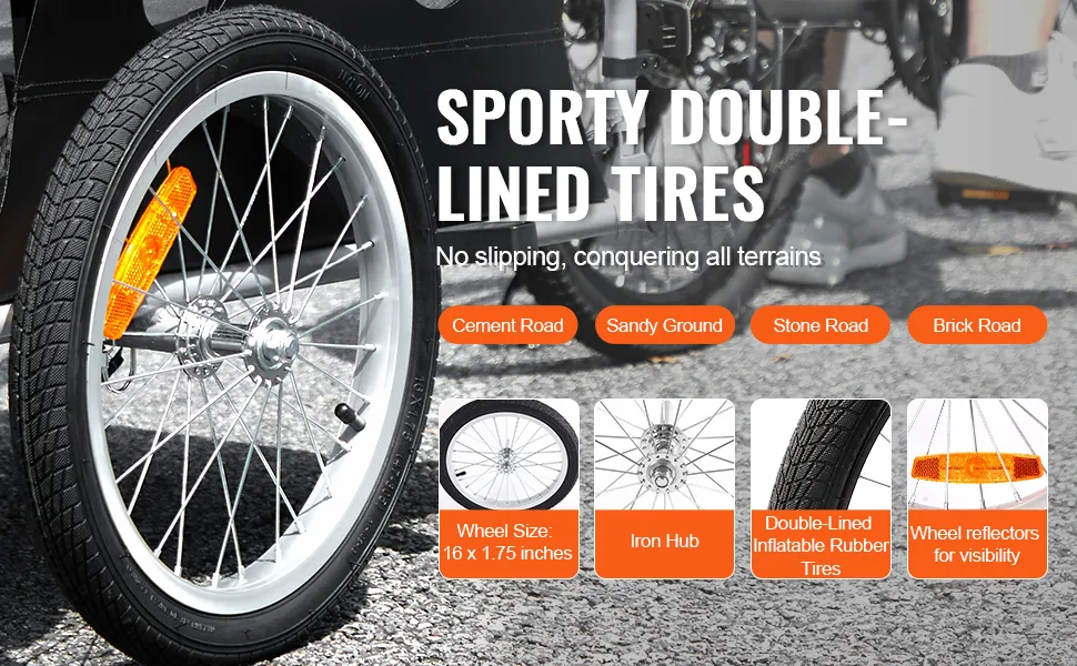Professionelles Reifendesign: Rollen Sie sanft auf jeder Straße! Unser Fahrradanhänger ist mit sportlichen 16 x 1,75 Zoll (40,64 x 4,45 cm) großen Reifen und Eisennaben ausgestattet und bietet hervorragende Stabilität und Traktion auf verschiedenen Oberflächen, egal ob Sie auf Beton fahren, Schotterwege befahren oder Sandwege in Angriff nehmen.