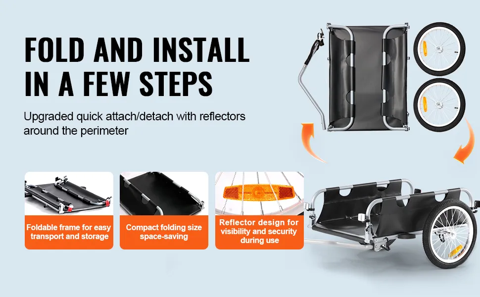 Dank des faltbaren Rahmens und des Schnellverschlusssystems ist das Aufstellen dieses Fahrradanhängers ein Kinderspiel. Außerdem sorgen die reflektierenden Aufkleber für einen Hauch von Stil und sorgen gleichzeitig für Ihre Sicherheit.