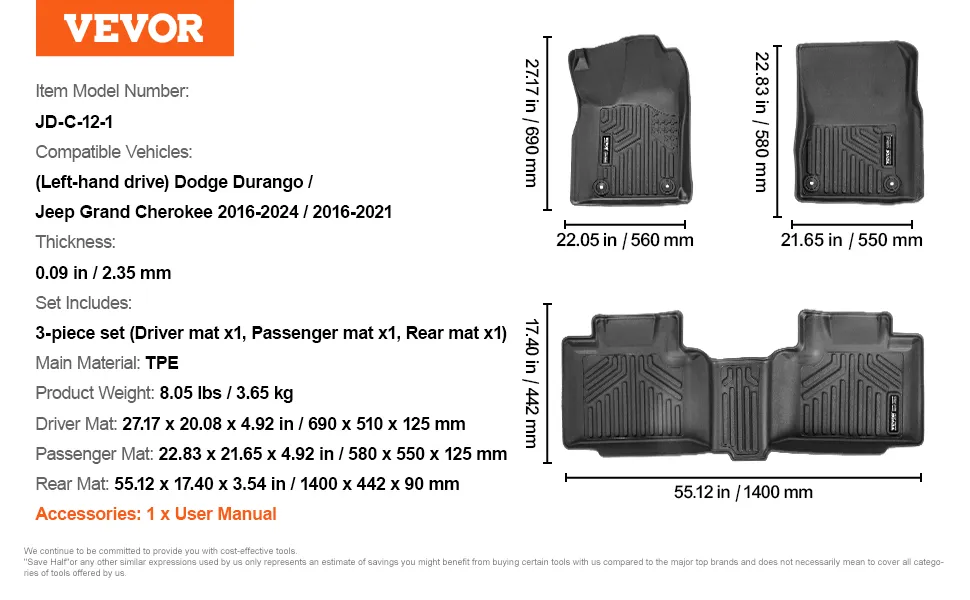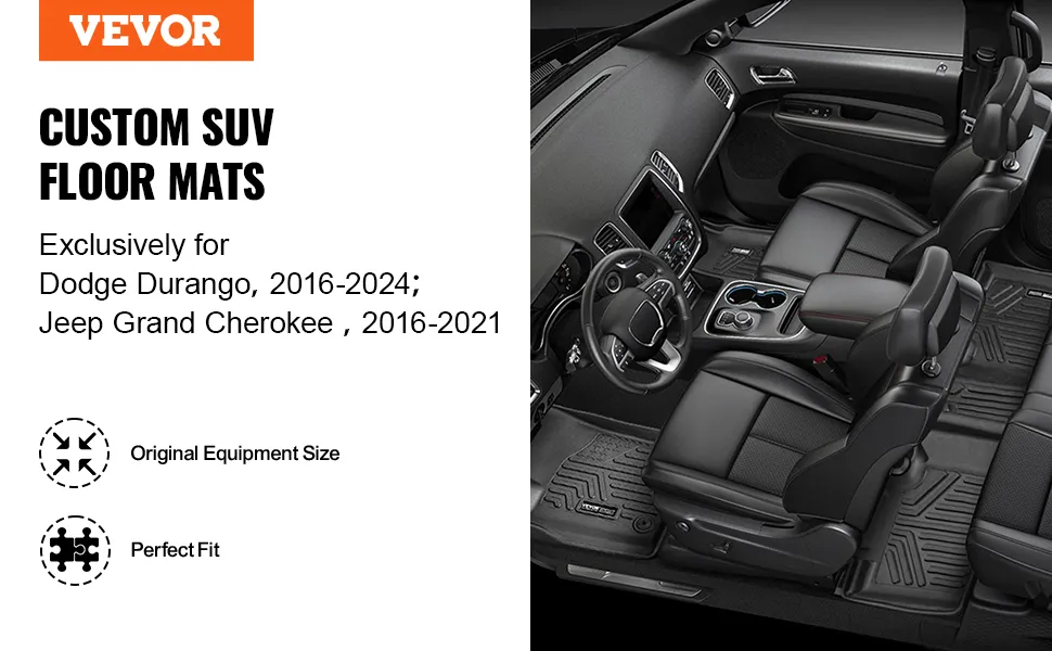 VEVOR Autofußmatten passend für Dodge Durango / Jeep Grand Cherokee 2016–2024 / 2016–2021, 3-teilig, Einlagen für die vordere und zweite Reihe wetterfeste maßgeschneiderte Fahrzeug-Fußmatten aus TPE