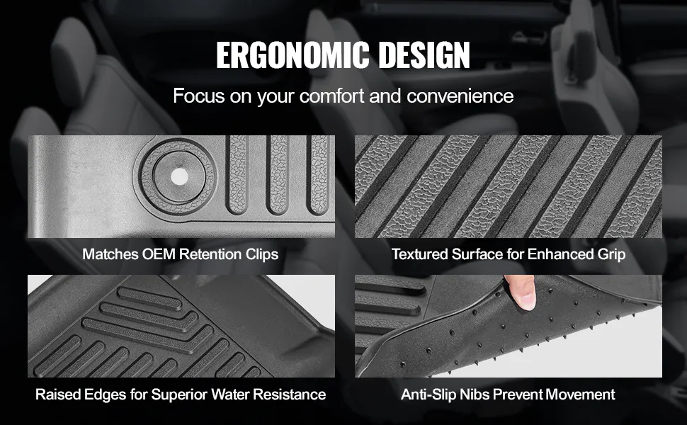 Erhöhte Ränder bieten wasserdichten Schutz vor Regen, Schlamm und Schnee, während rutschfeste Stifte dafür sorgen, dass die Matten an Ort und Stelle bleiben und Sie sich keine Sorgen machen müssen.