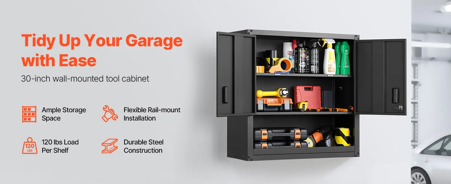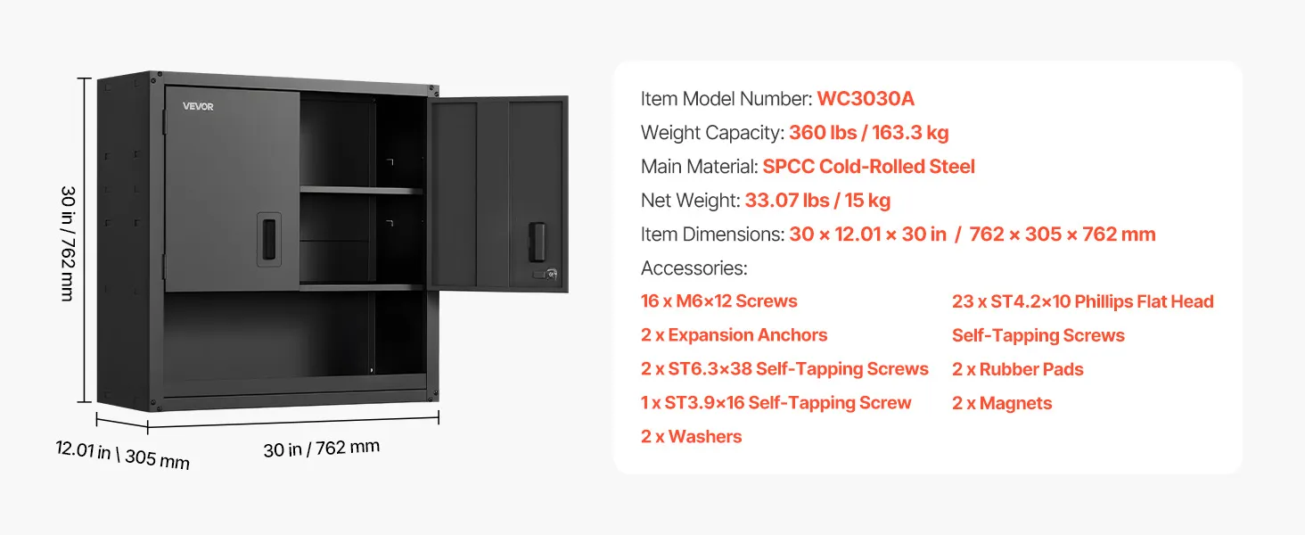 VEVOR Hängeschrank Werkstatt, 762 x 305 x 762 mm, Werkzeugschrank aus Stahl mit abschließbaren Türen & verstellbarem Regal, Wandhängeschrank für Garage, Keller, Küche, Lager, schwarz
