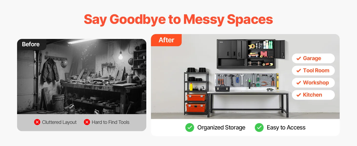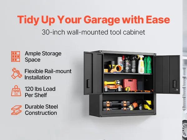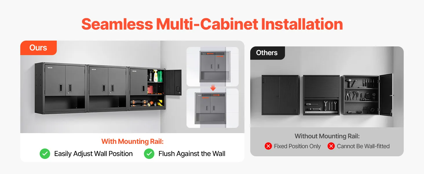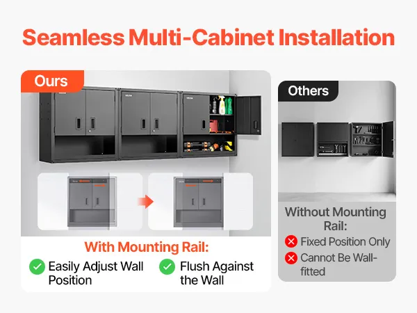 Flexible Installation: Das Schienenmontage-Design des Wandgaragenschranks ermöglicht eine schnelle, sichere und bündige Wandmontage. Ideal für Garagen, Küchen oder Werkstätten – passen Sie die Platzierung an Ihre Raumaufteilung an