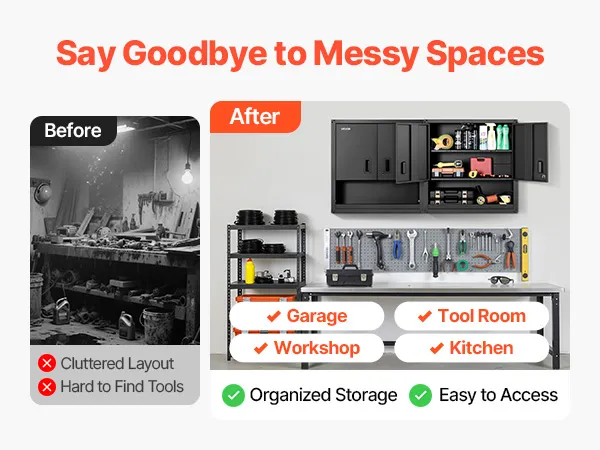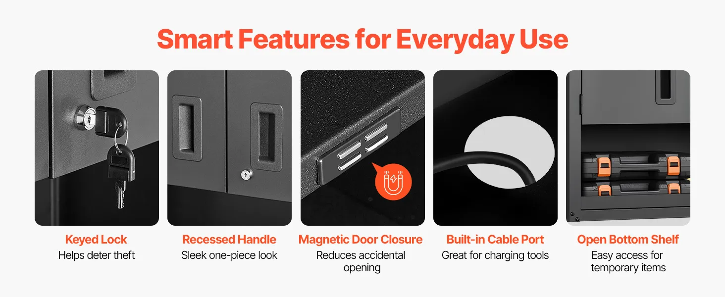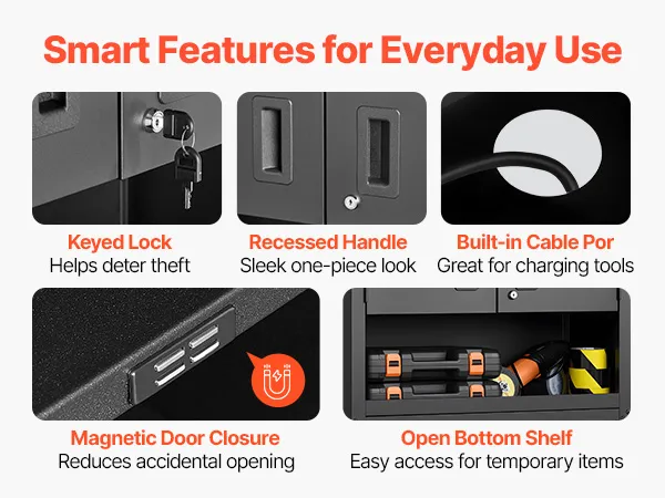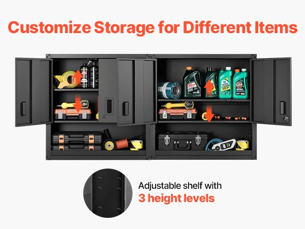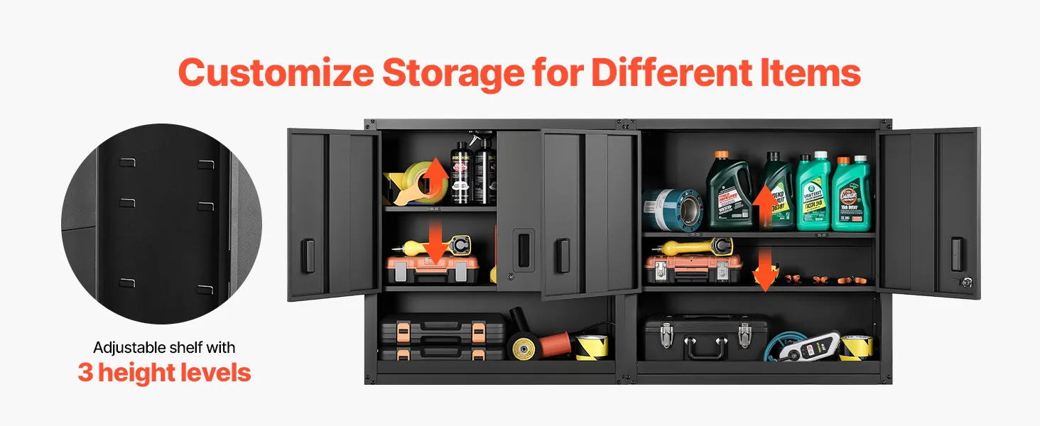 Leicht zugängliche Türen: Die beiden seitlichen Türen öffnen sich sanft und ermöglichen einen schnellen Zugriff. Ein Schloss des schwebenden Garagen-Werkzeugschranks schützt die Gegenstände, während Magnetverschlüsse die Türen für eine zuverlässige Nutzung fest verschlossen halten.