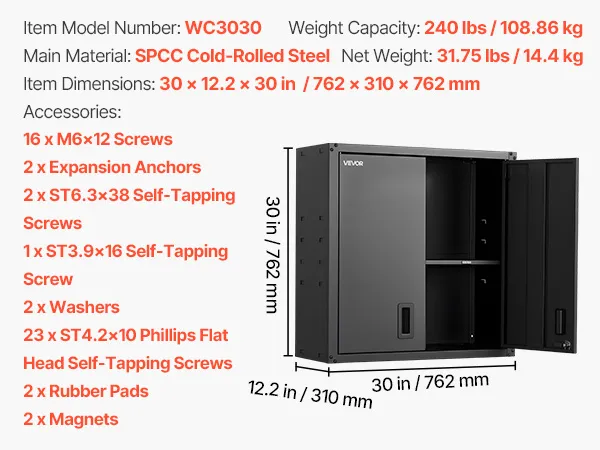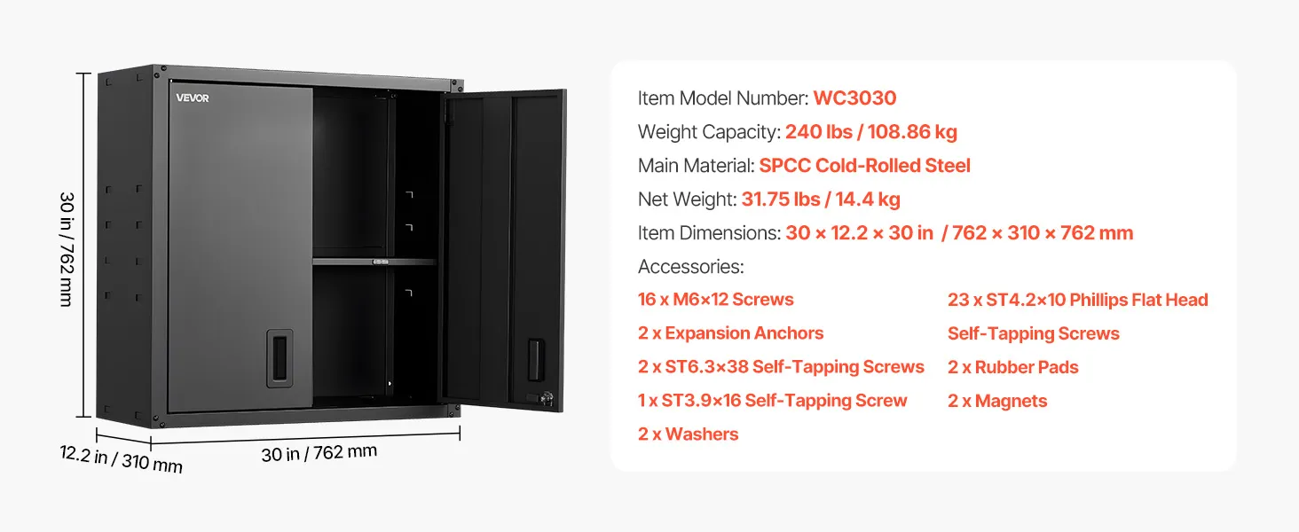 Robuste und langlebige Konstruktion: Dieser wandmontierte Lagerschrank ist aus dickem, kaltgewalztem SPCC-Stahl gefertigt und verfügt über eine Pulverbeschichtung für Rost- und Korrosionsbeständigkeit. Er bleibt jahrelang robust und zuverlässig.