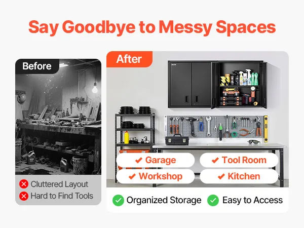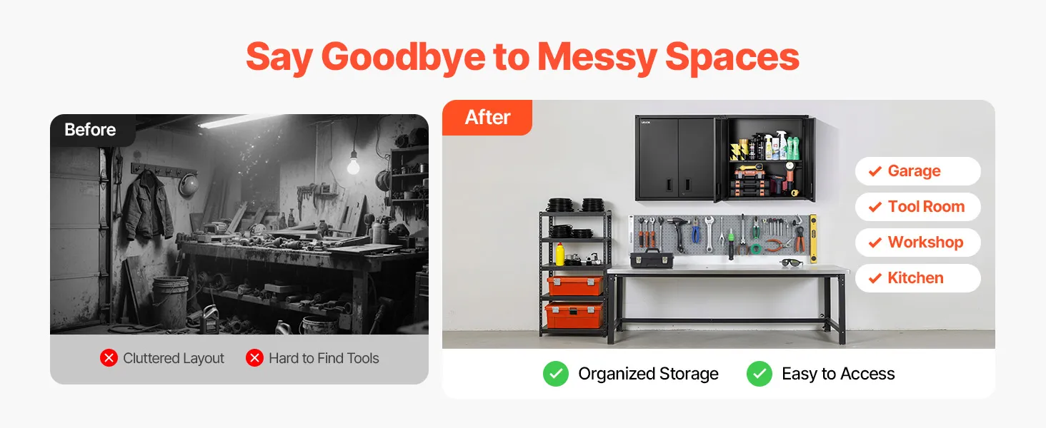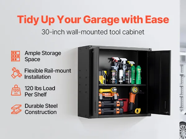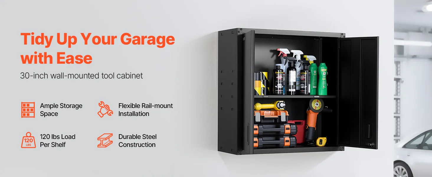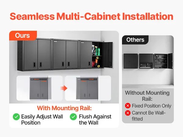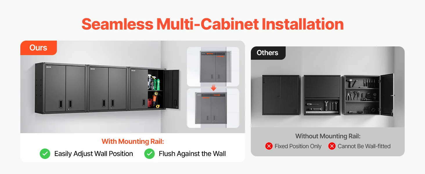 Flexible Installation: Das Schienenmontage-Design des Wandgaragenschranks ermöglicht eine schnelle, sichere und bündige Wandmontage. Ideal für Garagen, Küchen oder Werkstätten – passen Sie die Platzierung an Ihre Raumaufteilung an