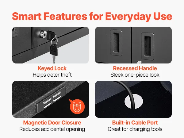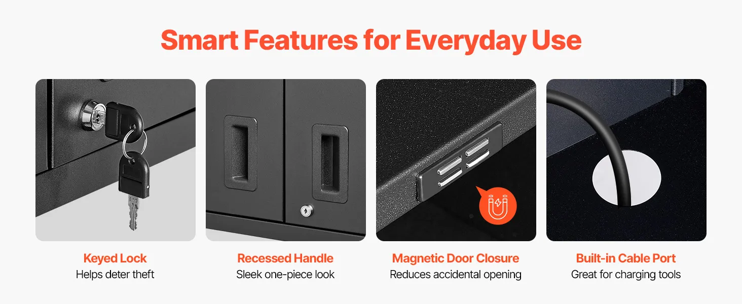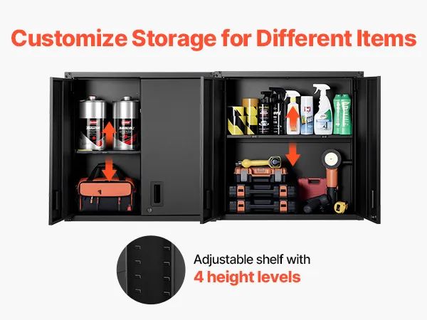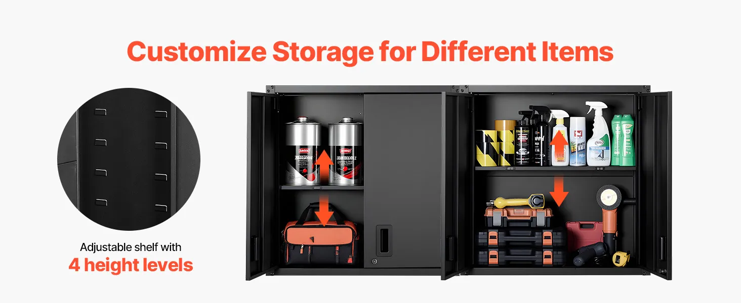 Leicht zugängliche Türen: Die beiden seitlichen Türen öffnen sich sanft und ermöglichen einen schnellen Zugriff. Ein Schloss des schwebenden Garagen-Werkzeugschranks schützt die Gegenstände, während Magnetverschlüsse die Türen für eine zuverlässige Nutzung fest verschlossen halten.