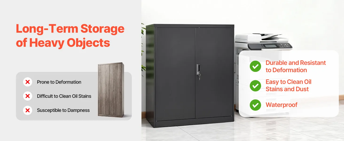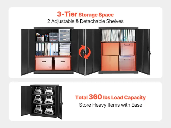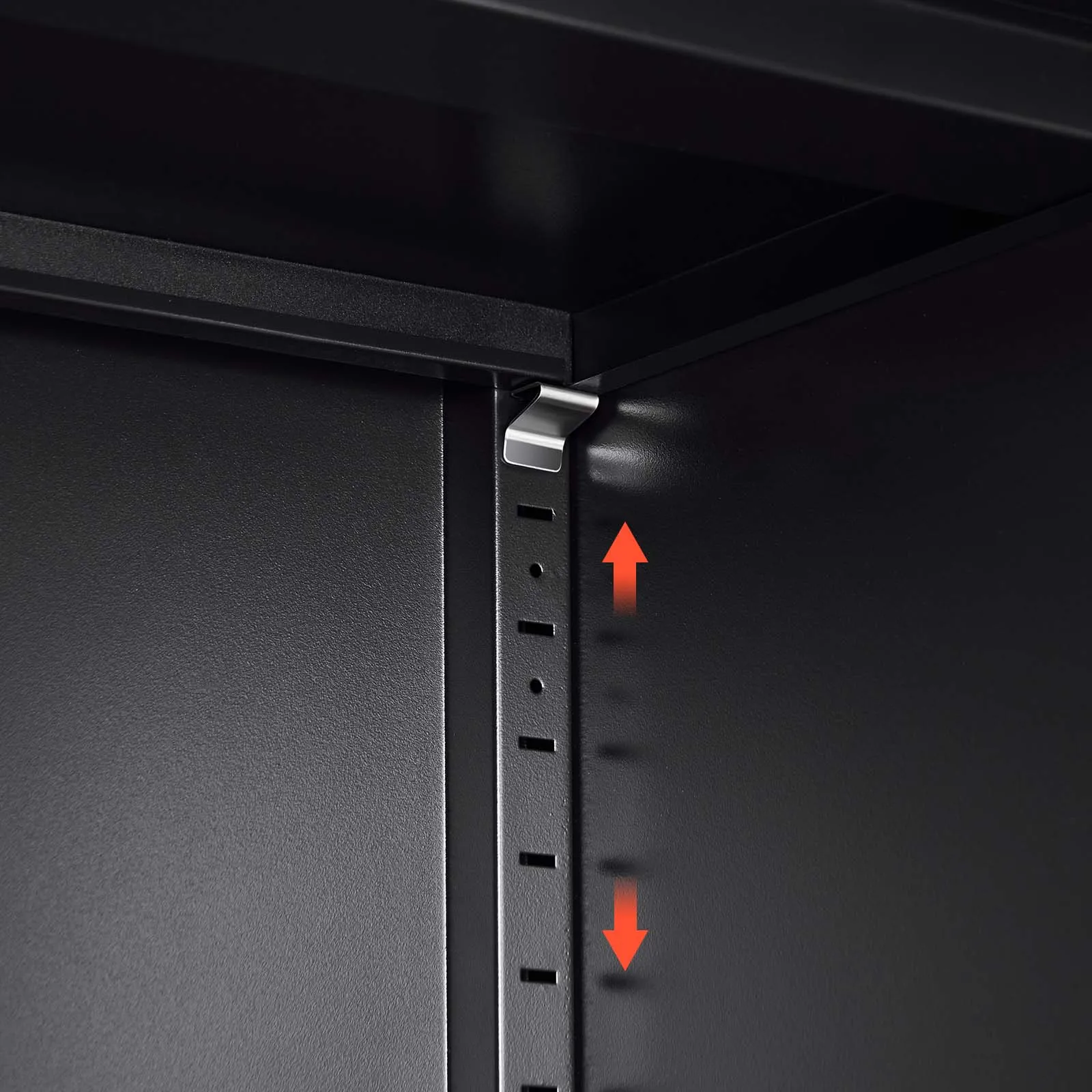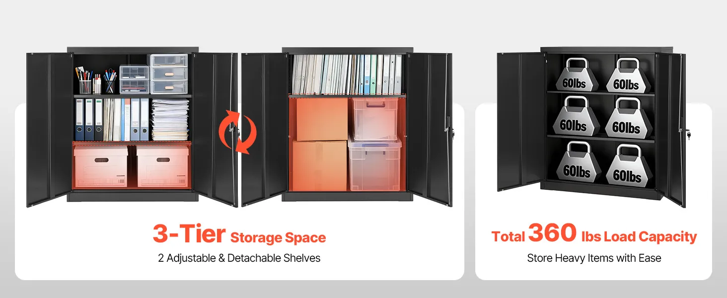 Maximale Stauraumnutzung: Dieser Metallschrank bietet drei geräumige Ebenen mit zwei verstellbaren und herausnehmbaren Einlegeböden, die sich ideal für Gegenstände unterschiedlicher Höhe eignen. Dank seines flexiblen Designs ist er perfekt zur Aufbewahrung von Büroakten, Werkzeugen für die Garage oder Haushaltsgegenständen