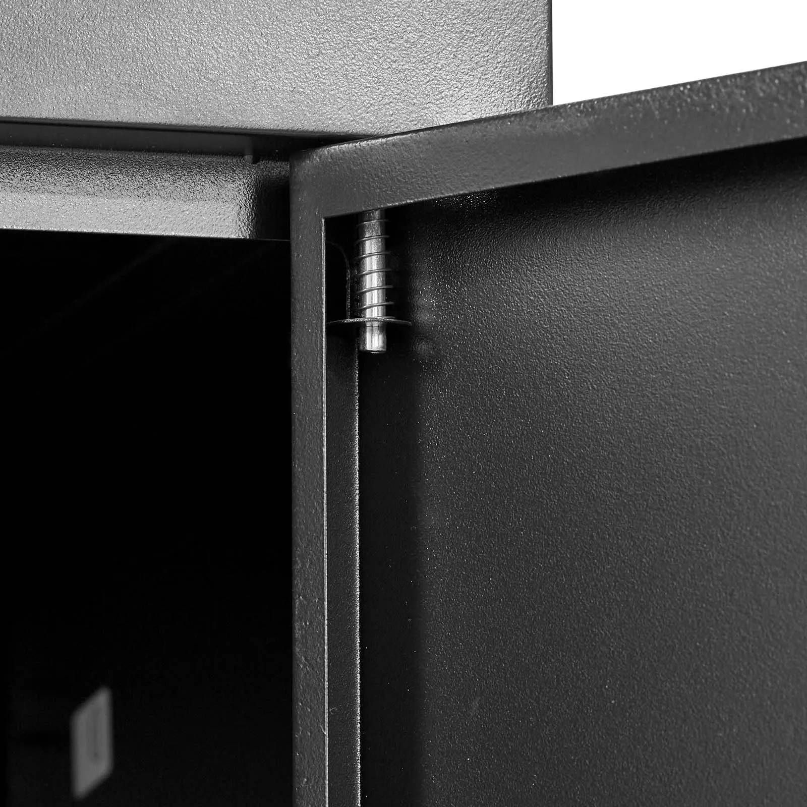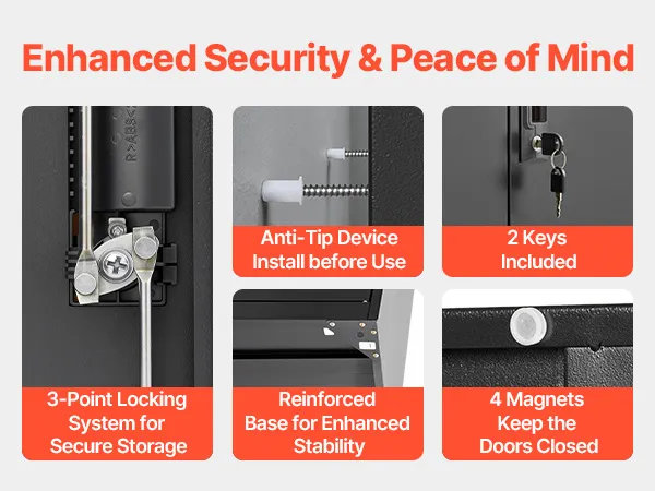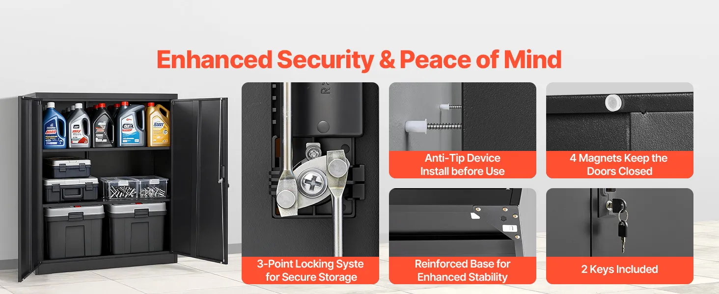 Sicher & stabil: Ein Dreipunkt-Schloss mit zwei Schlüsseln schützt Ihre Gegenstände in diesem Garagenschrank. Vier Magnetverschlüsse halten die Türen fest geschlossen, während verstärkte Dreiecksstützen ein Umkippen verhindern.