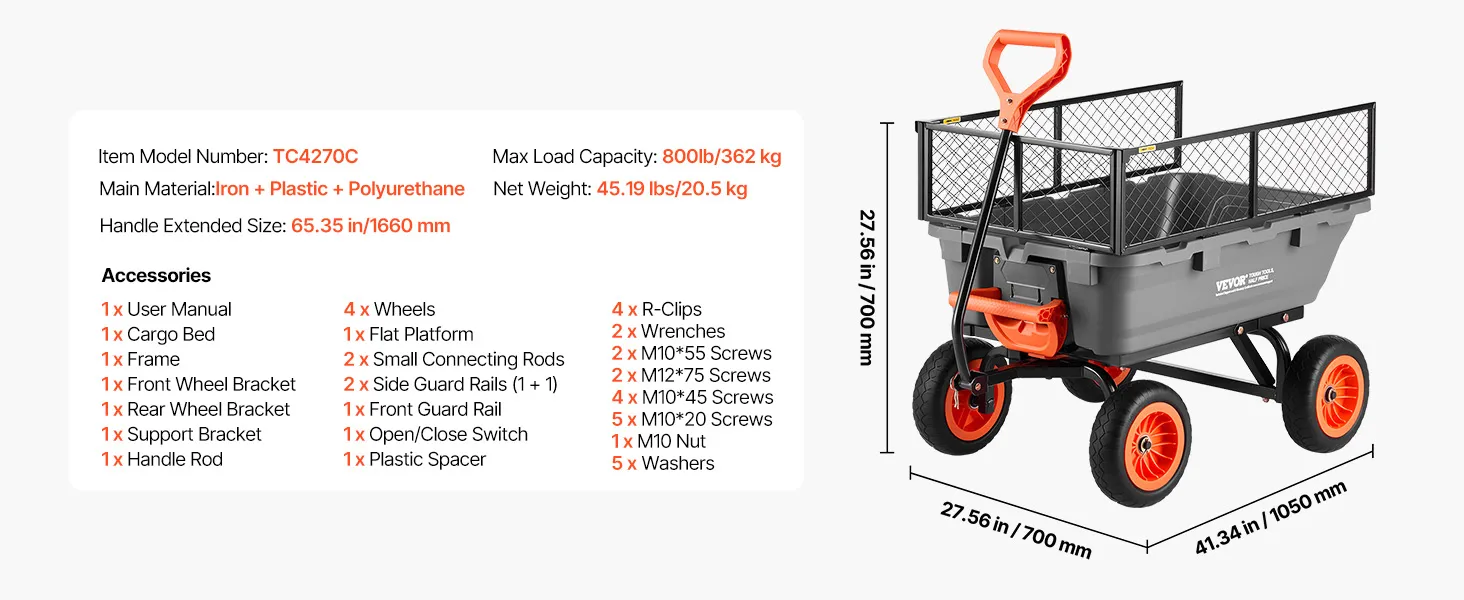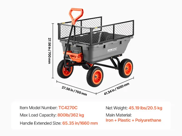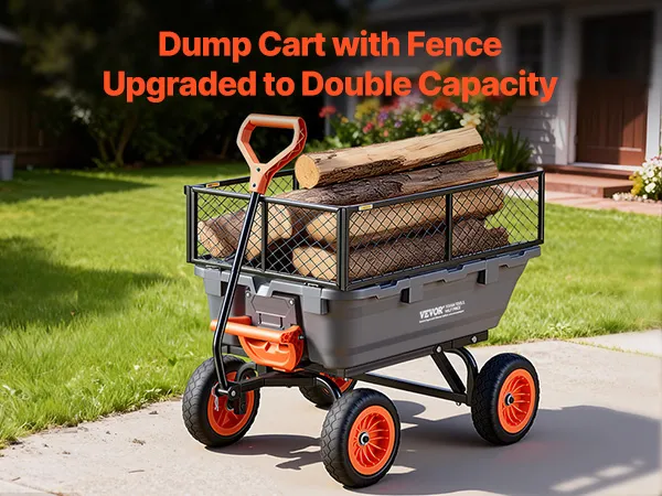 Hohe Tragkraft: Unser Gartenkipper fasst bis zu 800 lbs / 362 kg Erde, Brennholz, Kies oder Erntegut. Er transportiert mehr in einer Fahrt, reduziert so die Anzahl der Fahrten und sorgt für einen reibungsloseren Arbeitsablauf im Garten oder auf dem Bauernhof – dank seiner stabilen Handhabung bei allen täglichen Aufgaben