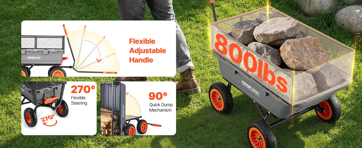 VEVOR Gartenwagen mit Kippfunktion, 362 kg Belastbarer Bollerwagen 270° Drehbarer Transportwagen für Gartenarbeit aus Kunsttoff Stahl mit 10 Zoll Kunststoffreifen Metallzaun für Rasen, Kies & Schlamm