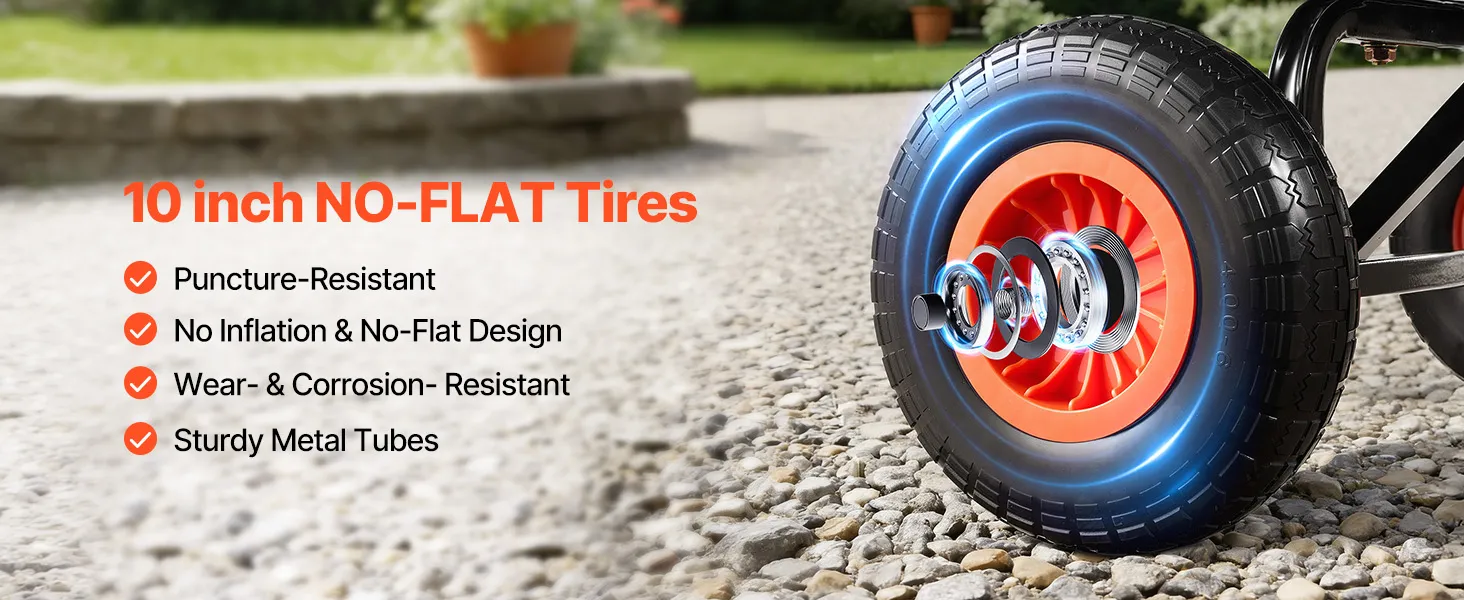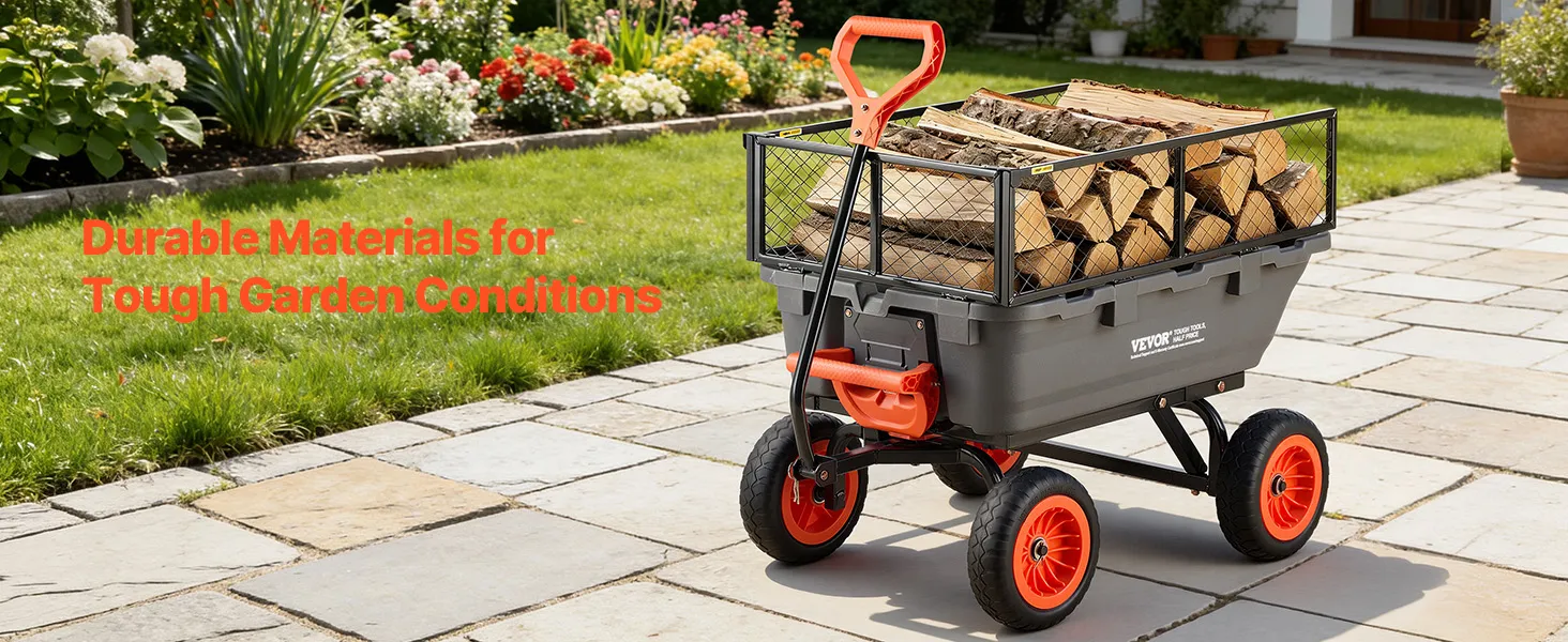 Geländegängiges Fahren: Ausgestattet mit pannensicheren 10 Zoll / 254 mm-PU-Rädern, bewältigt dieser Gartenwagen mühelos Gras, Schlamm und Kies. Seine PP-Ladefläche und der rostgeschützte Rahmen sind auch bei wechselndem Einsatz im Freien robust und gewährleisten zuverlässige Bewegung bei der Garten- oder Feldarbeit
