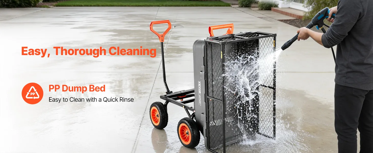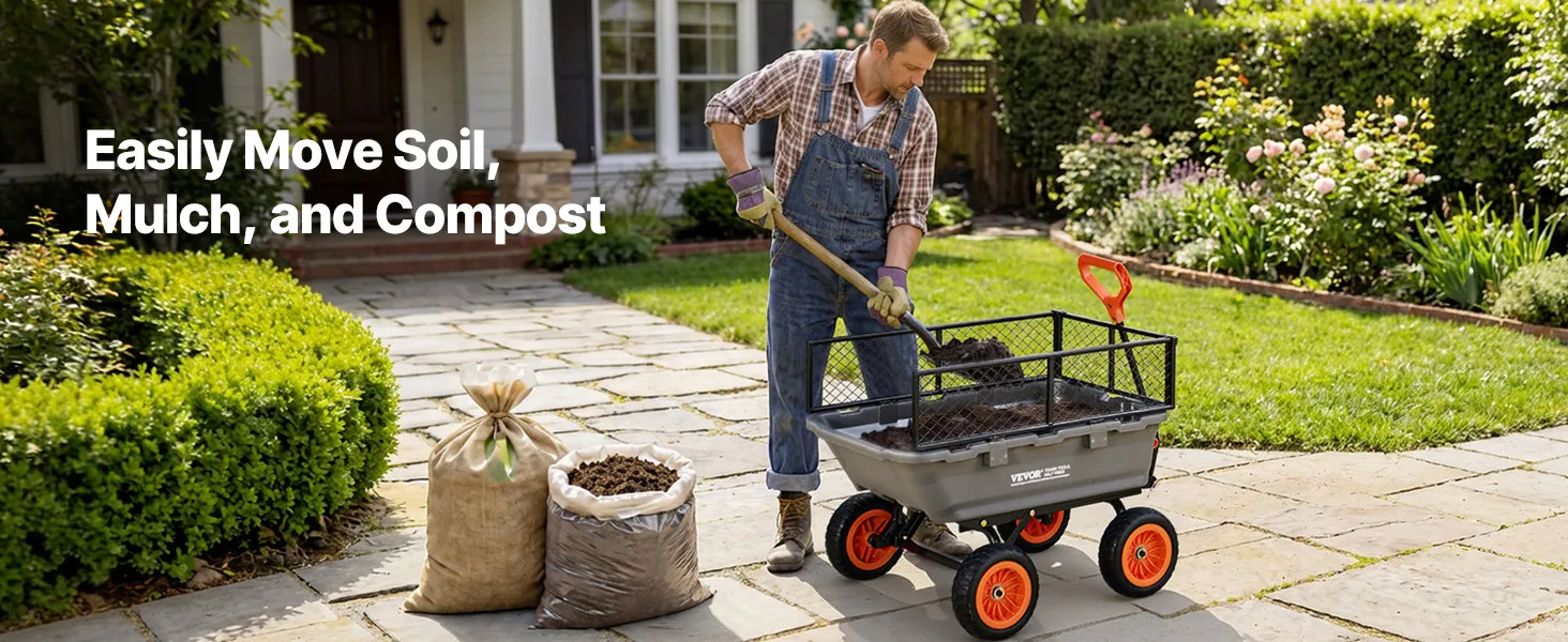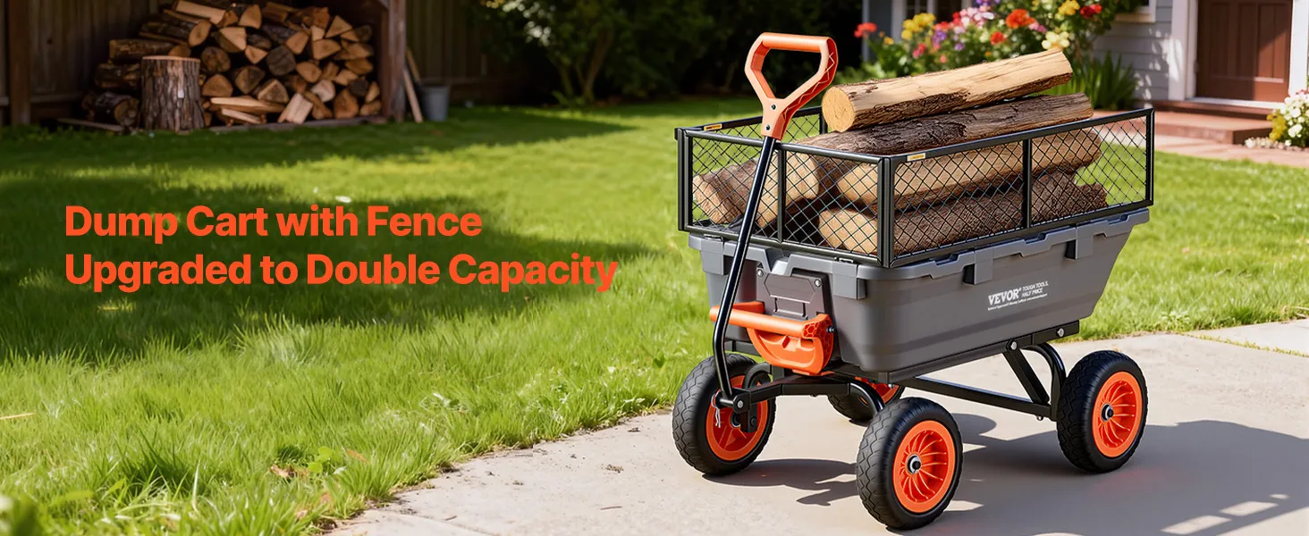 Unser 800 lbs / 362 kg belastbarer Gartenwagen mit Schutzgitter bietet ein Schnell-Kippsystem für einfaches Be- und Entladen. Ein 90°-Schwenkgriff und 180°-Räder sorgen für leichte Kontrolle, während die Wanne schnell per Abspritzen reinigt. Ideal für Pflanzen, Erde und Ernte bei Hof- oder Feldarbeiten.