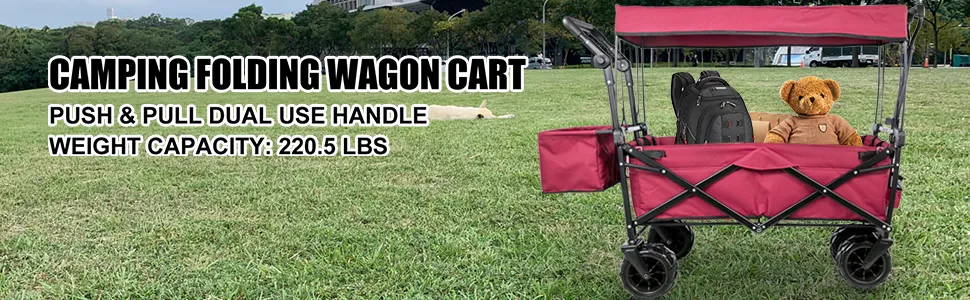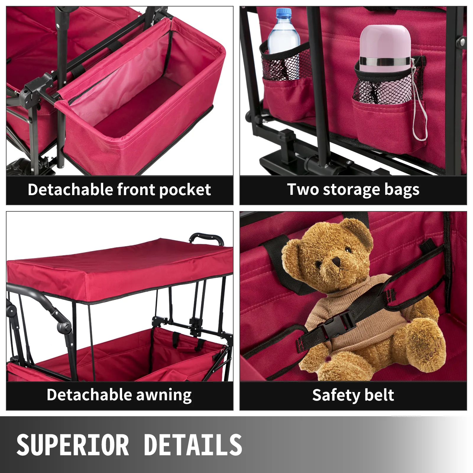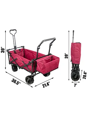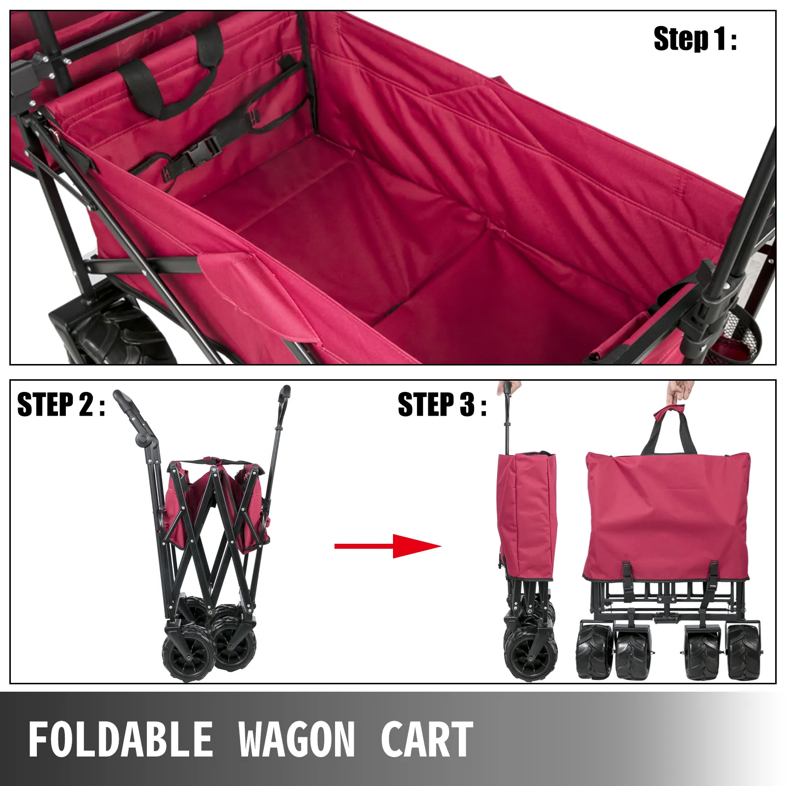 Der rote Utility-Klappwagen mit abnehmbarem Baldachin und Geländerädern besteht aus hochwertigem 600D-Oxford-Stoff und stabilem Stahlrahmen. Das um 360 Grad drehbare Offroad-Rad erleichtert das Einparken, Schieben und Ziehen. Größerer Stauraum, zusätzlicher Aufbewahrungskorb und zwei Netzbeutel bieten mehr Platz. Es kann leicht in Sekunden geöffnet und zusammengeklappt werden. Ein praktisches Werkzeug zum Packen und Bewegen von Dingen bei Outdoor-Aktivitäten.