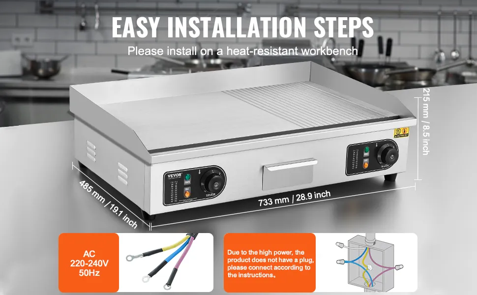 Die elektrische Grillplatte mit flacher Oberseite eignet sich perfekt zum Zubereiten von Fleisch, Eiern, Pfannkuchen, Steaks und vielem mehr. Sie ist sowohl für private als auch gewerbliche Küchen geeignet.