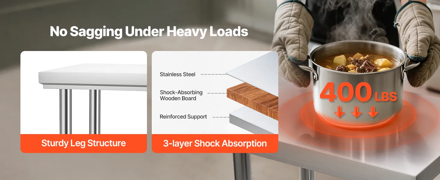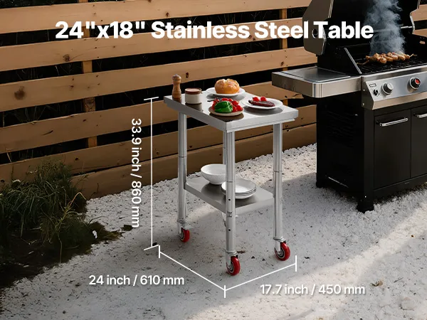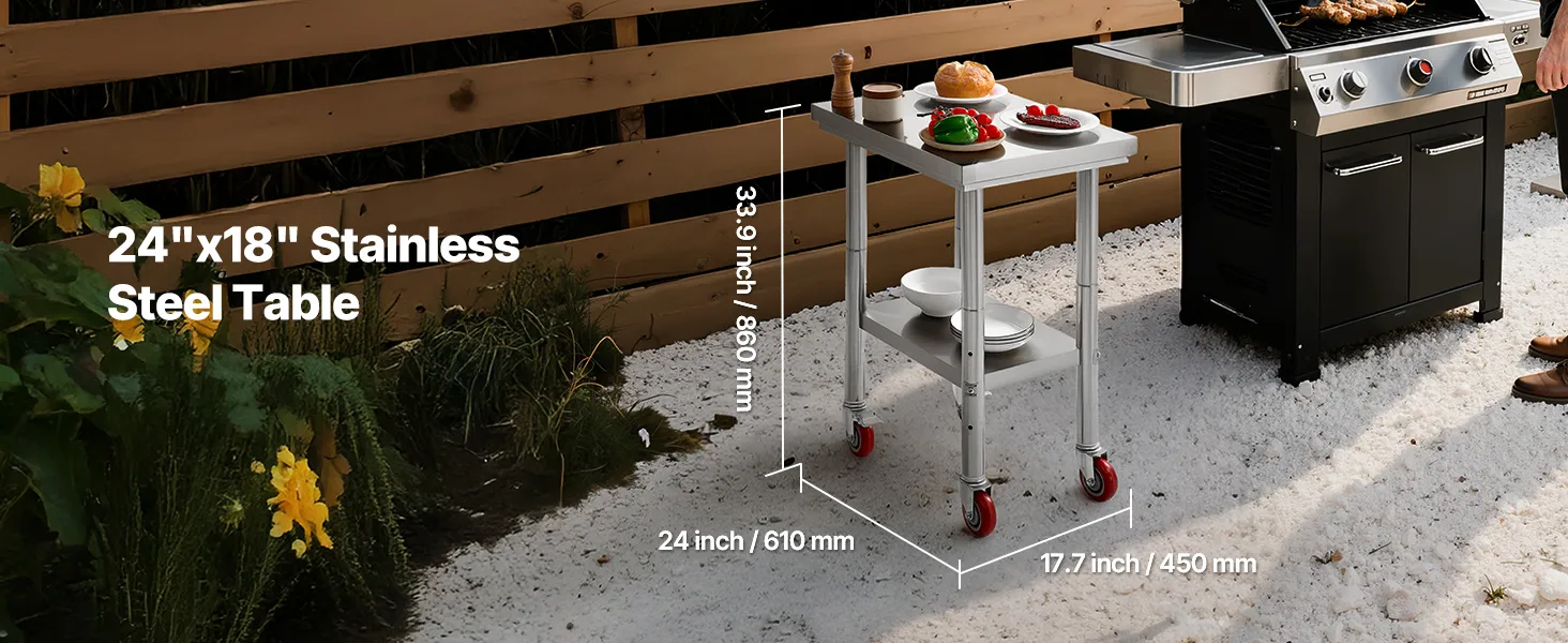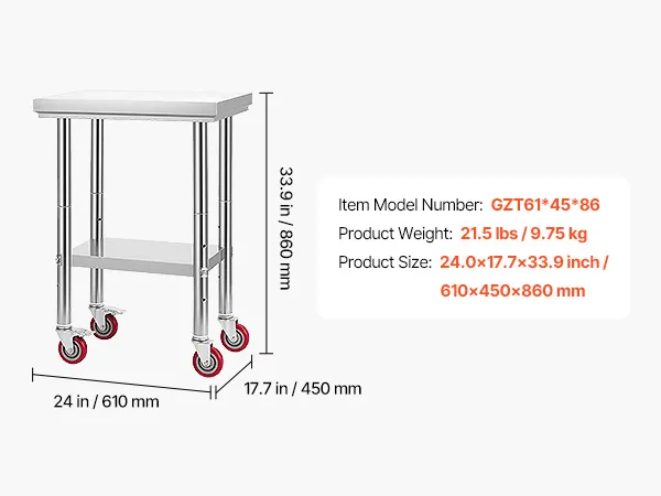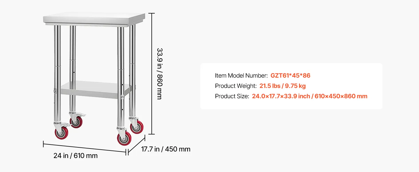 Hochwertiger Edelstahl: Unser 24,0 x 17,7 x 33,9 Zoll (10 x 450 x 860 mm) großer Arbeitstisch besteht aus SUS201-Edelstahl für Tischplatte, Regale und Beine. Er ist rostbeständig, sieht elegant aus und lässt sich leicht mit einem Wisch reinigen