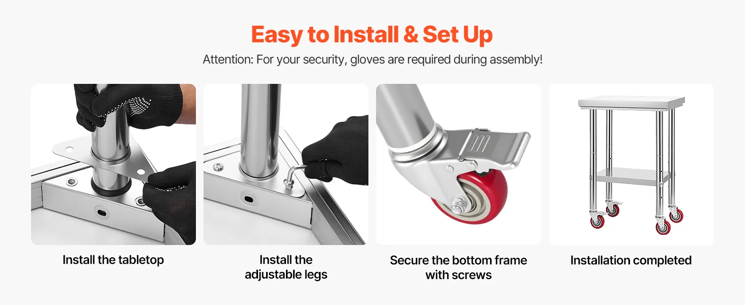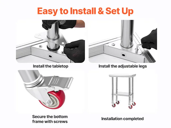 Die einfache Struktur des gewerblichen Küchentisches erleichtert die Installation. Befolgen Sie die Anweisungen im Handbuch für eine schnelle Montage.