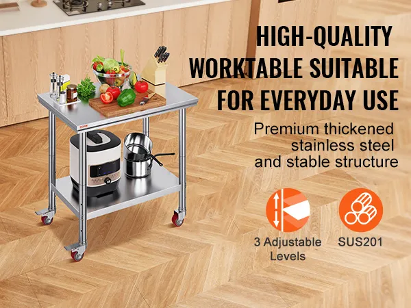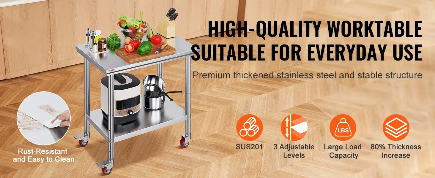 Der VEVOR 24 x 36 Edelstahl-Arbeitstisch ist aus hochwertigem SUS201-Edelstahl gefertigt, der für seine Stärke, seinen Glanz und seine Rostbeständigkeit bekannt ist. Tischplatte und Beine sind präzisionsgefertigt und erfüllen höchste Hygiene- und Langlebigkeitsstandards. Die glatte, polierte Oberfläche bleibt erhalten. Ob im Restaurant oder in der heimischen Küche – dieser Tisch behält seine Stabilität über Jahre hinweg.