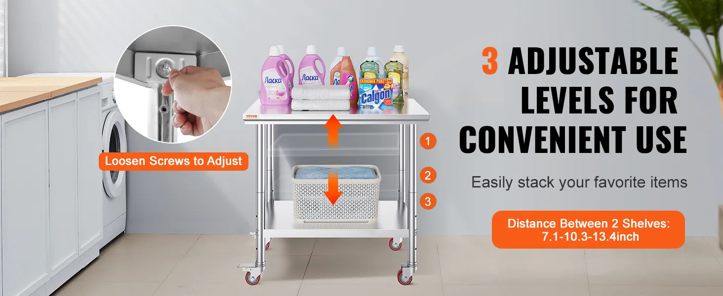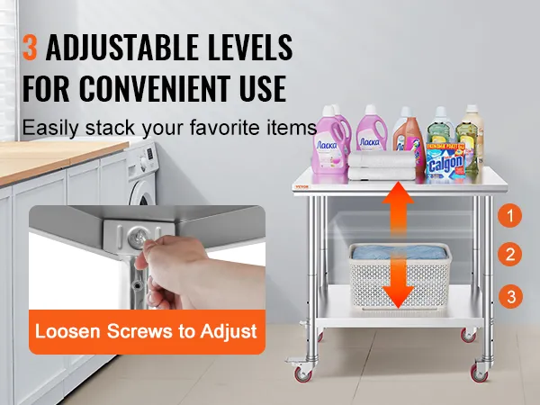 Der VEVOR 24 x 36 Edelstahl-Arbeitstisch verfügt über drei verstellbare Ablagen, sodass Sie den Stauraum flexibel an Ihre Bedürfnisse anpassen können. Die Höhe der unteren Ablage lässt sich mithilfe der mitgelieferten Schrauben verstellen – ideal für kleine Küchenutensilien oder große Behälter. Dank dieser Flexibilität haben Sie immer ausreichend Platz zum Arbeiten.