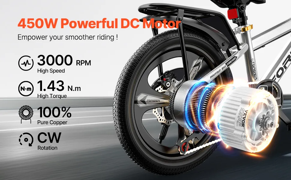 Rüsten Sie Ihr Fahrrad selbstbewusst auf und erleben Sie mehr Leistung, Zuverlässigkeit und Fahrspaß mit dem leistungsstarken 450-W-36-V-Gleichstrommotor, dem verbesserten Controller, 1,43 Nm Nenndrehmoment und CW-Richtungssteuerung.