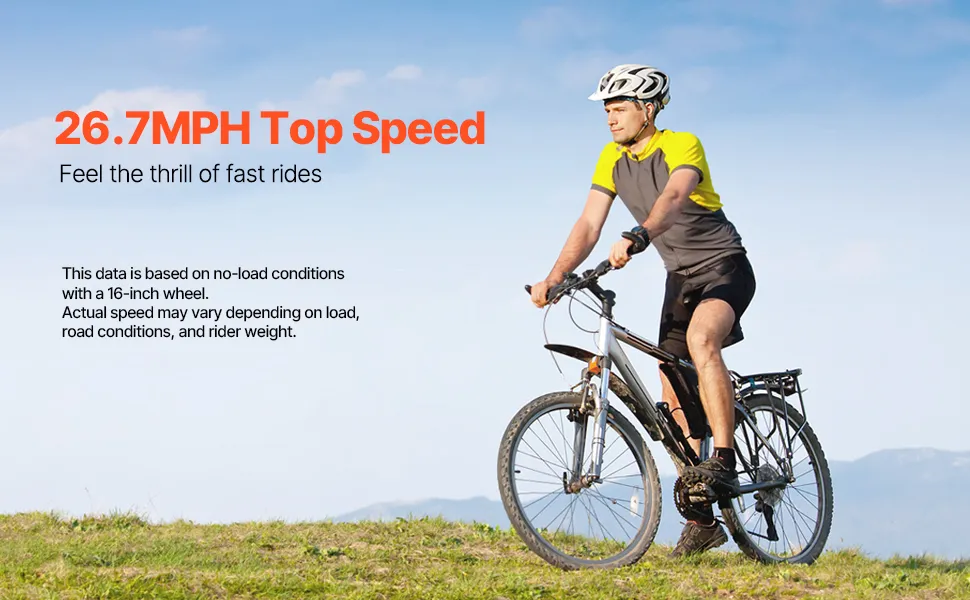 Erleben Sie den ultimativen Nervenkitzel mit 26,7 MPH Leerlaufgeschwindigkeit! (Diese Höchstgeschwindigkeit basiert auf Leerlaufbedingungen mit einem 16-Zoll-Rad – die tatsächliche Geschwindigkeit kann je nach Beladung, Straßenbedingungen und Fahrergewicht variieren)