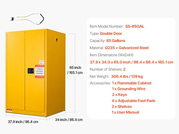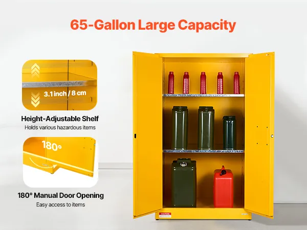 Geräumiger & verstellbarer Stauraum: Dieser Schrank für brennbare Flüssigkeiten bietet ein großzügiges Fassungsvermögen von 65 Gal (246 L) und zwei höhenverstellbare Einlegeböden. Er bietet problemlos Platz für brennbare Flüssigkeiten wie Alkohol, Klebstoff, Lackverdünner oder Benzin. Organisieren und sichern Sie Ihre Materialien effizient in einer einzigen, sicheren Einheit