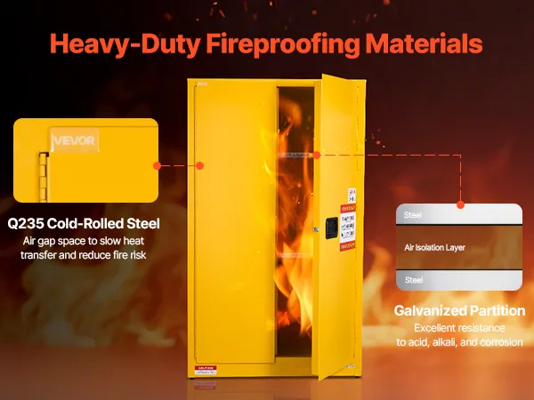 Zuverlässig & langlebig: Dieser Feuerschrank besteht aus vollverschweißtem kaltgewalztem Q235-Stahl mit einem Luftspalt in der Türverkleidung, um die Wärmeübertragung zu reduzieren und das Brand- und Explosionsrisiko zu minimieren. Verzinkte Einlegeböden bieten hervorragende Verschleiß- und Korrosionsbeständigkeit und bleiben auch unter rauen Industriebedingungen formstabil