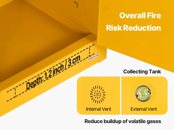 Mehrschichtiger Schutz: Unser Lagerschrank für brennbare Stoffe ist mit internen und externen Belüftungsöffnungen ausgestattet, um die Bildung von Dämpfen zu reduzieren. Eine Auffangwanne am Boden hilft, verschüttete Flüssigkeiten aufzufangen, während der Erdungsleiter statische Aufladung und Explosionsgefahr reduziert. Mehrere Schutzschichten sorgen für mehr Sicherheit
