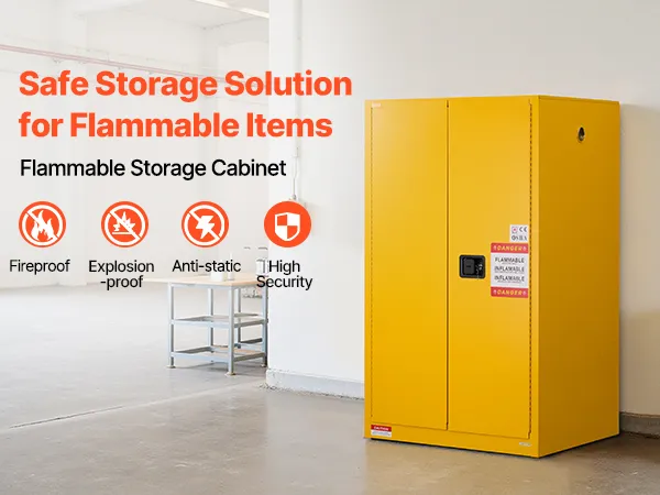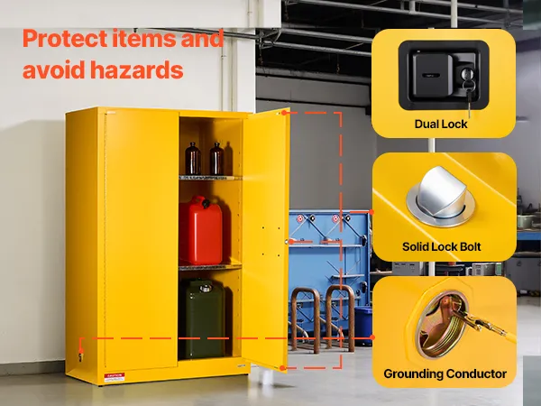 Unser 65-Gallonen-Schrank aus kaltgewalztem Q235-Stahl mit geschweißtem Gehäuse ist langlebig und resistent gegen Korrosion und Verformung. Er verfügt über Entlüftungsöffnungen, eine Auffangwanne und ein Erdungskabel zum Schutz vor Explosionen und statischer Aufladung. Geeignet für die Lagerung verschiedener brennbarer Materialien in Werkstätten, Fabriken und Garagen.