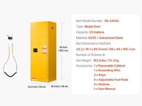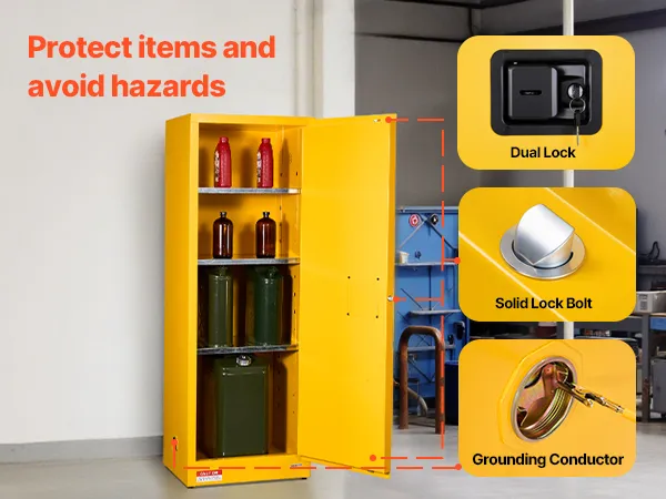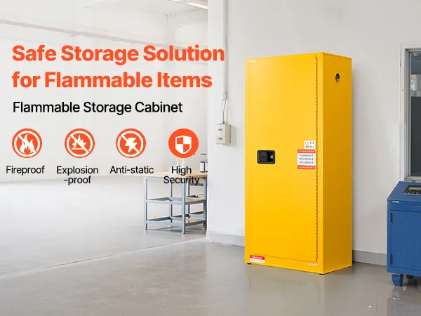 Unser 23-Gallonen-Schrank aus kaltgewalztem Q235-Stahl mit einem geschweißten Gehäuse ist langlebig und korrosions- und verformungsbeständig. Er verfügt über Entlüftungsöffnungen, eine Auffangwanne und ein Erdungskabel zum Schutz vor Explosionen und statischer Aufladung. Geeignet für die Lagerung verschiedener brennbarer Materialien in Werkstätten, Fabriken und Garagen.