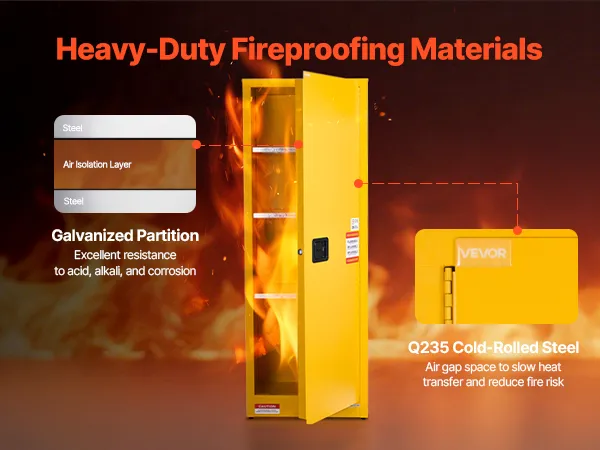 Zuverlässig & langlebig: Dieser Feuerschrank besteht aus vollverschweißtem kaltgewalztem Q235-Stahl mit einem Luftspalt in der Türverkleidung, um die Wärmeübertragung zu reduzieren und das Brand- und Explosionsrisiko zu minimieren. Verzinkte Einlegeböden bieten hervorragende Verschleiß- und Korrosionsbeständigkeit und bleiben auch unter rauen Industriebedingungen formstabil