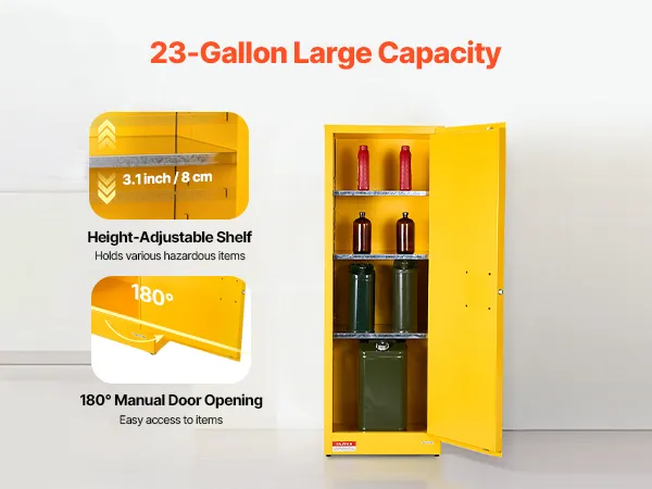 Geräumiger & verstellbarer Stauraum: Dieser Schrank für brennbare Flüssigkeiten bietet ein großzügiges Fassungsvermögen von 23 Gal (87,06 L) und drei höhenverstellbare Einlegeböden. Er bietet problemlos Platz für brennbare Flüssigkeiten wie Alkohol, Klebstoff, Lackverdünner oder Benzin. Organisieren und sichern Sie Ihre Materialien effizient in einer einzigen, sicheren Einheit