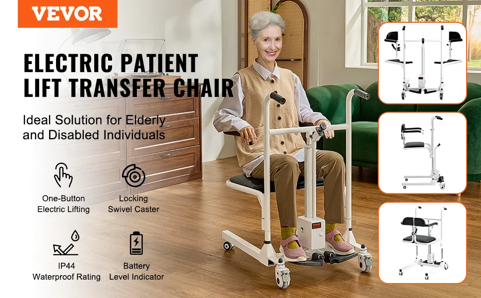 Der elektrische Patientenlifter von VEVOR verfügt über eine elektrische Hebefunktion per Knopfdruck, feststellbare Lenkrollen, ist wasserdicht nach IP44 und verfügt über eine Batteriestandsanzeige, die einen sicheren und stabilen Transfer im Innen- und Außenbereich gewährleistet.