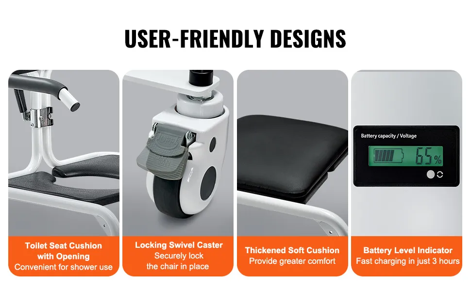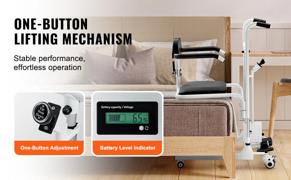 Bequemes elektrisches Heben: Verabschieden Sie sich vom manuellen Heben! Dieser elektrische Transfer-Lift-Rollstuhl ermöglicht elektrisches Heben per Knopfdruck und spart so Zeit und Mühe. Der Lithium-Ionen-Akku mit hoher Kapazität ermöglicht bis zu 214 Hebevorgänge bei voller Ladung und ist in nur 4 Stunden wieder aufgeladen. Und die zusätzliche Akkuanzeige erleichtert dem Pflegepersonal den Komfort erheblich, indem sie Updates zum Akkustatus in Echtzeit liefert.
