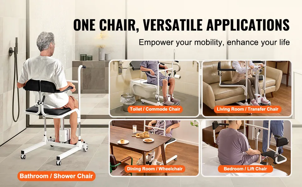 Ob im Badezimmer, Schlafzimmer oder Esszimmer, dieser Duschstuhl für Behinderte erfüllt verschiedene Anforderungen und kann als Duschstuhl, Toilettenstuhl, Toilettenstuhl, Rollstuhl oder Hebestuhl verwendet werden.