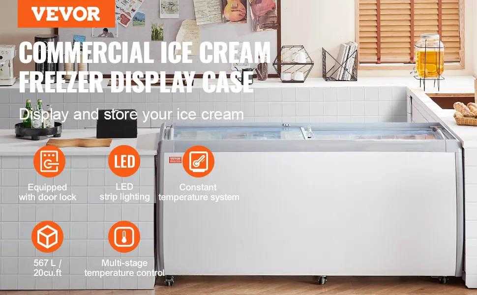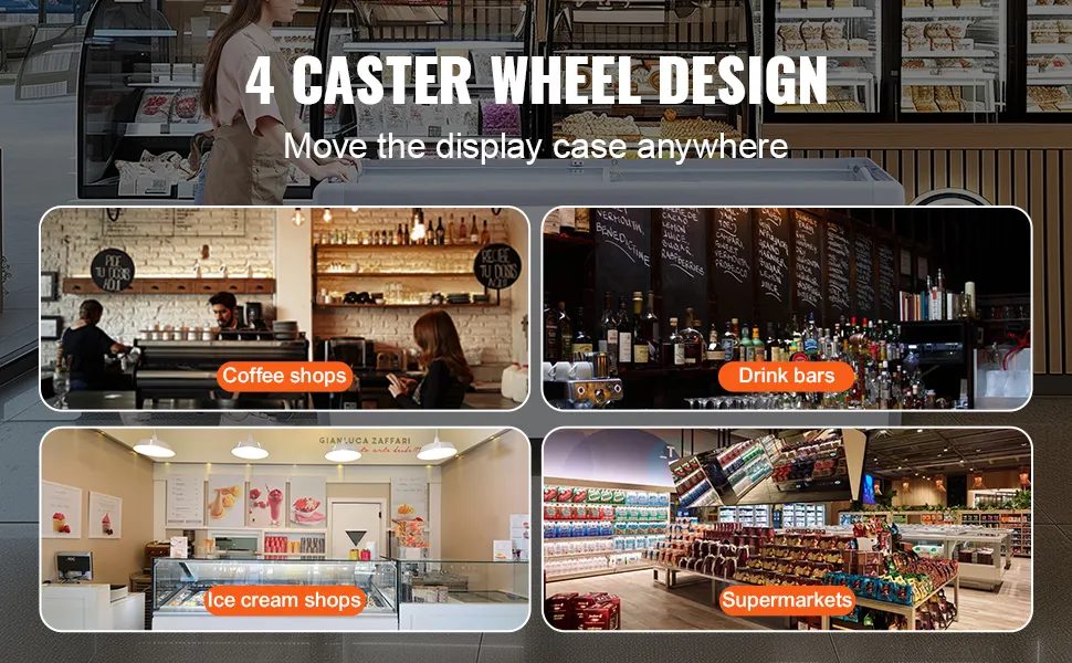Die mobile Tiefkühltruhe mit Glasplatte kann in Cafés, Bars, Eisdielen, Supermärkten usw. eingesetzt werden und ermöglicht eine langfristige Präsentation von Speiseeis.