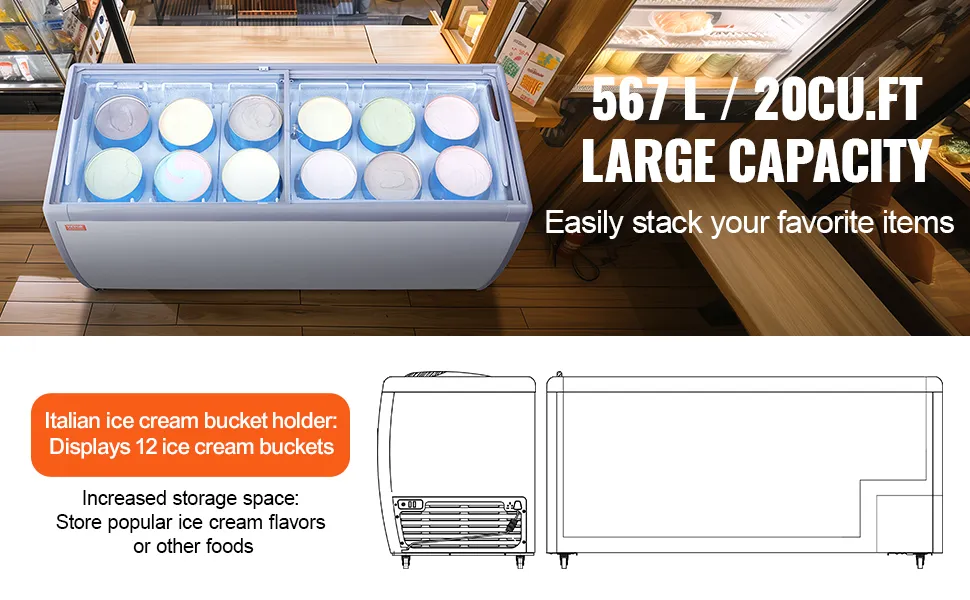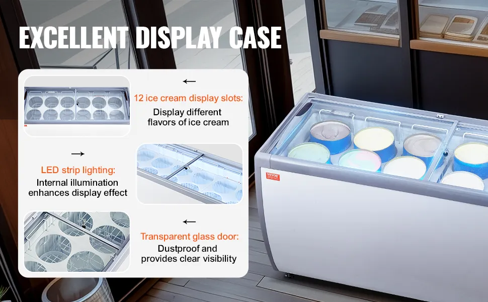 Professionelle Eisvitrine: Diese kommerzielle Eisvitrine bietet Platz für 12 große Eisbecher und ist mit einer LED-Beleuchtung und einer gut sichtbaren Tür aus gehärtetem Glas ausgestattet, um den Präsentationseffekt zu verbessern. Der Kunde kann sein Lieblingseis leicht auswählen.