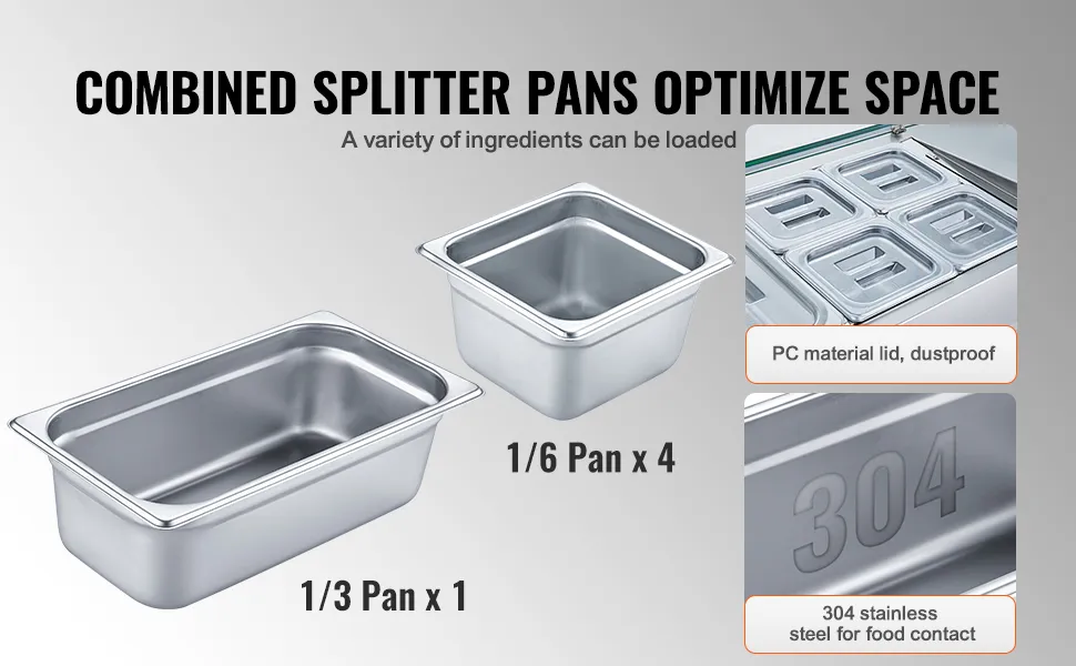 Modulares Tablettsystem: Unsere gekühlte Gewürzstation verfügt über 1 Stk. 1/3 Pfannen und 4 Stk. 1/6 Pfannen, was die Kapazität für einen flexiblen Einsatz erhöht. Herausnehmbare Trennwände helfen Ihnen, die Bereiche sinnvoll zu trennen, um Geschmacksübertragungen zu vermeiden und die Zutaten frischer zu halten. Hergestellt aus Edelstahl 304 und mit Behältern aus PC-Material mit dicht schließenden Deckeln zum Schutz vor Staub und Insekten. Sicher und zuverlässig. Je nach Bedarf können Sie zwischen verschiedenen Größen wählen, um Ihren unterschiedlichen Anforderungen an die Aufbewahrung und Präsentation von Lebensmitteln gerecht zu werden.