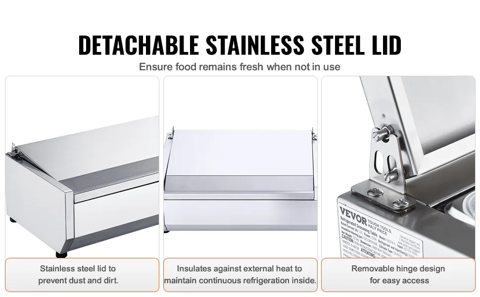 Edelstahlschutz: Unsere gekühlte Gewürzstation ist mit einem abnehmbaren Klappdeckel aus Edelstahl ausgestattet, der das Eindringen von Staub und Schmutz verhindert und die Kälte einschließt, damit die Lebensmittel bei Nichtgebrauch frisch und sauber bleiben.